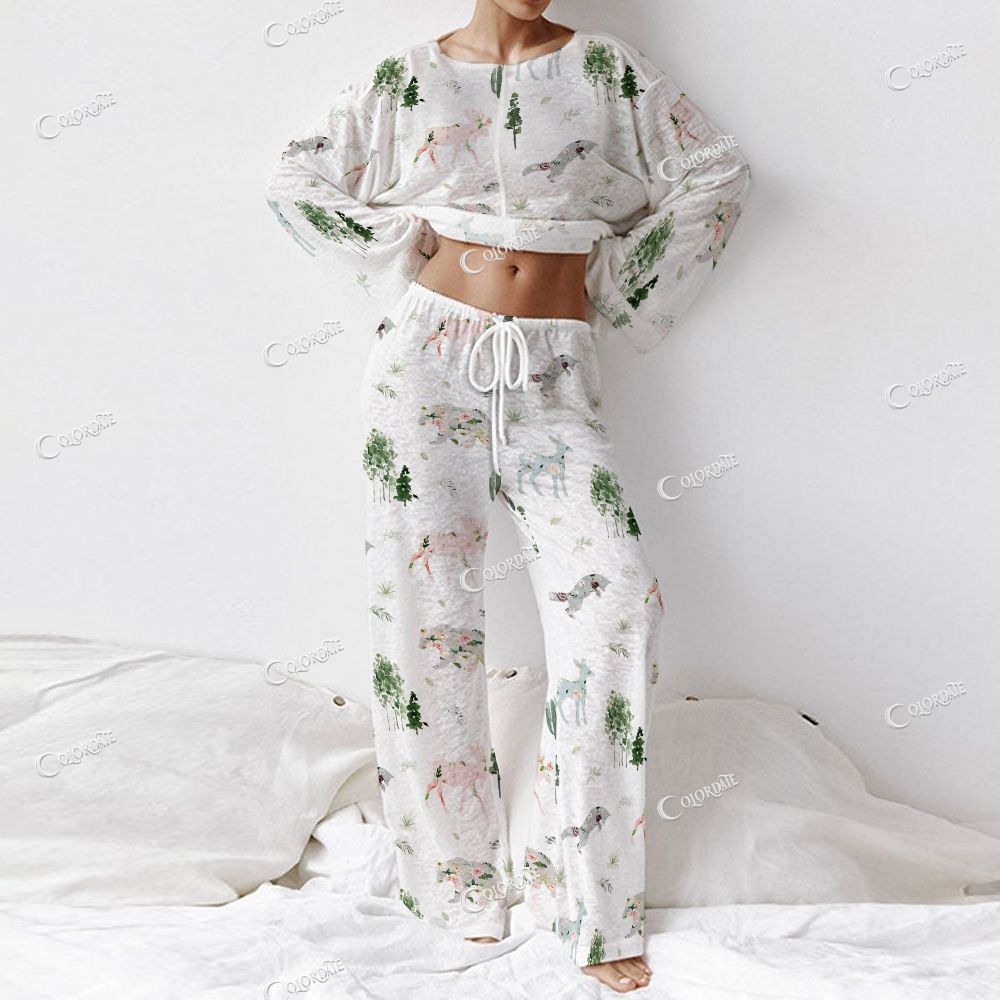 Colordate Women's Forest Animal Print Long Sleeve Cotton Homewear Set