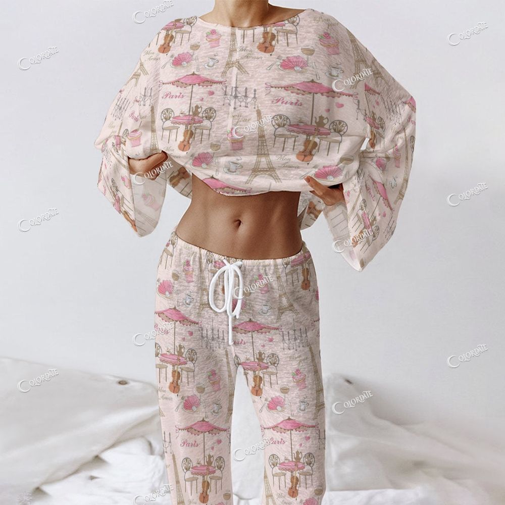 Colordate Women's Paris Print Long Sleeve Cotton Homewear Set