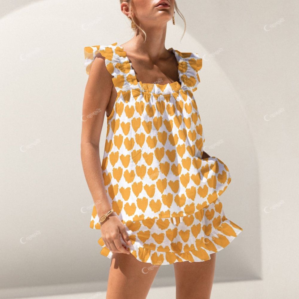 Colordate Yellow Heart Print Short Tank Top Shorts Pajama Set