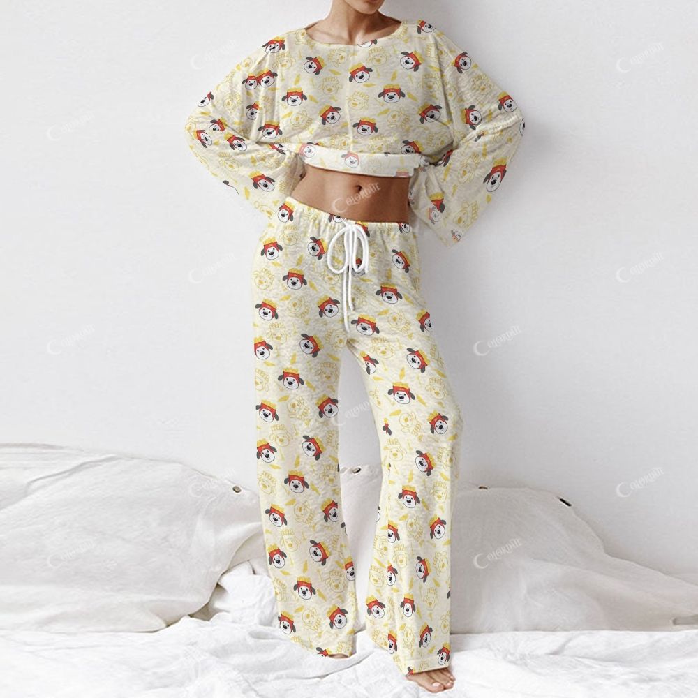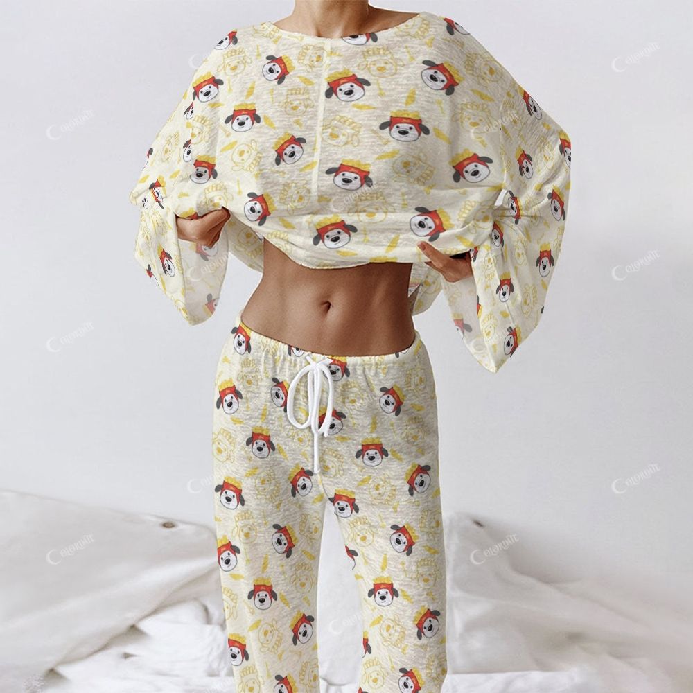 Colordate Women's French Fries, Puppy Print Long Sleeve Cotton Homewear Set