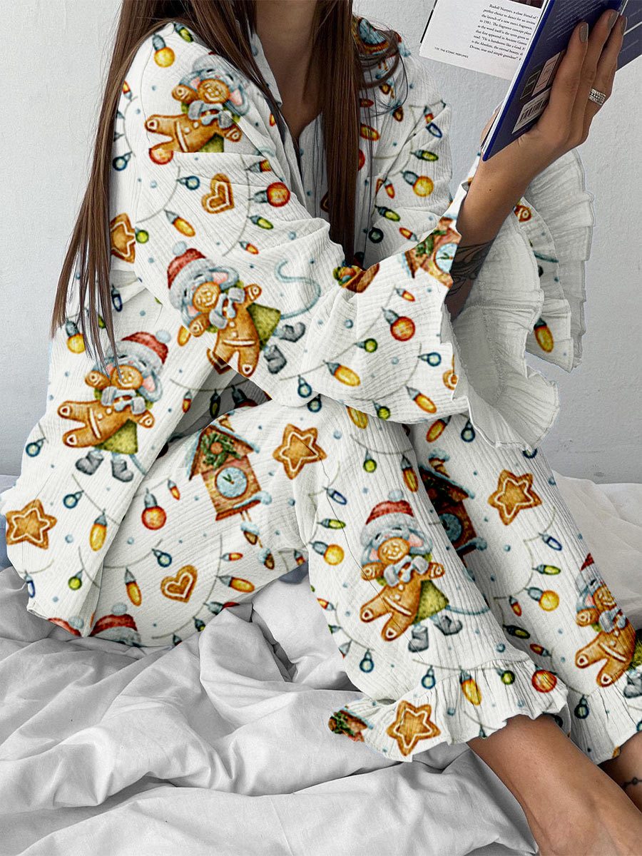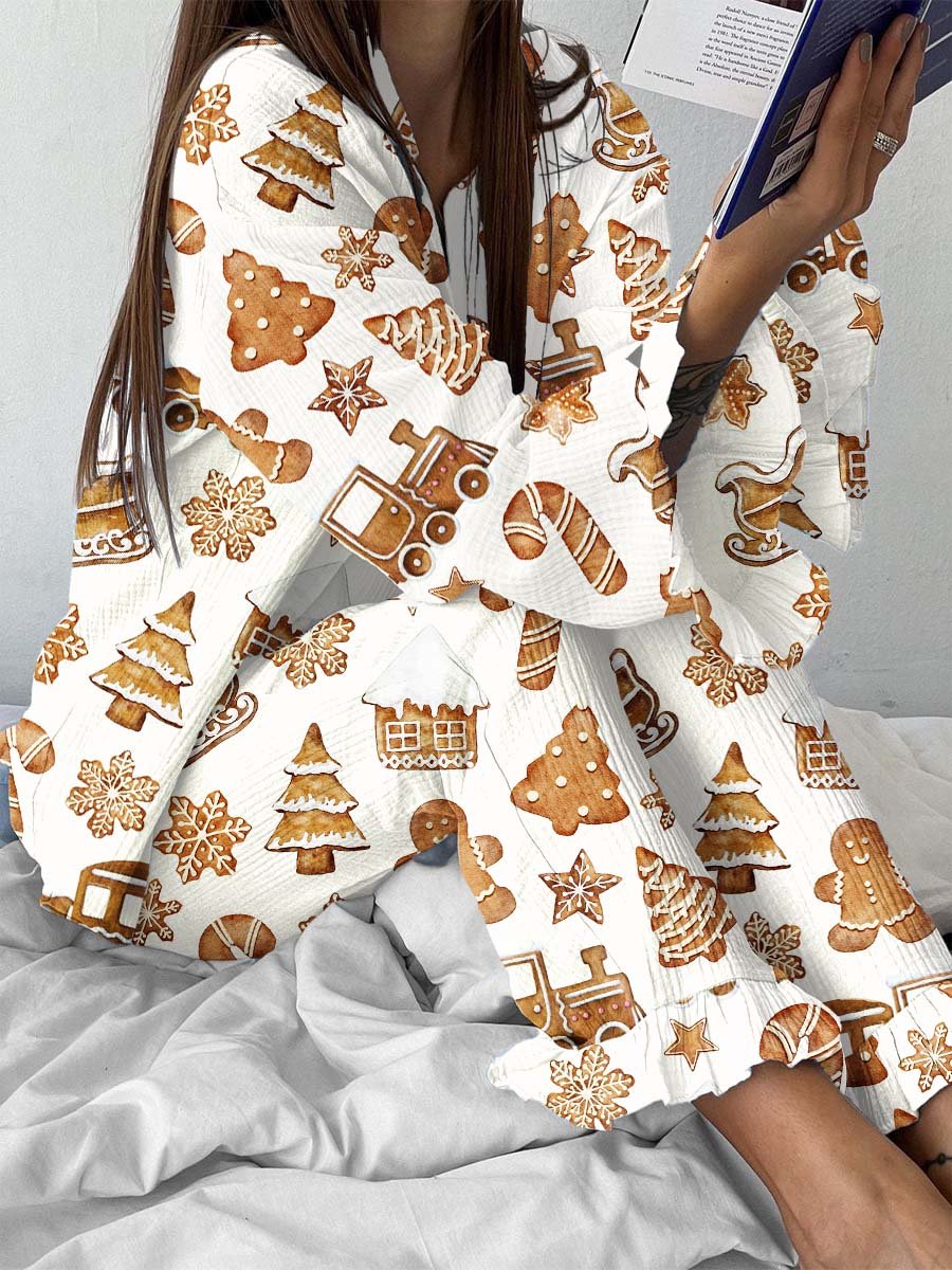 Women's Christmas Cookie Bow Pattern Long Sleeve Pant Suit