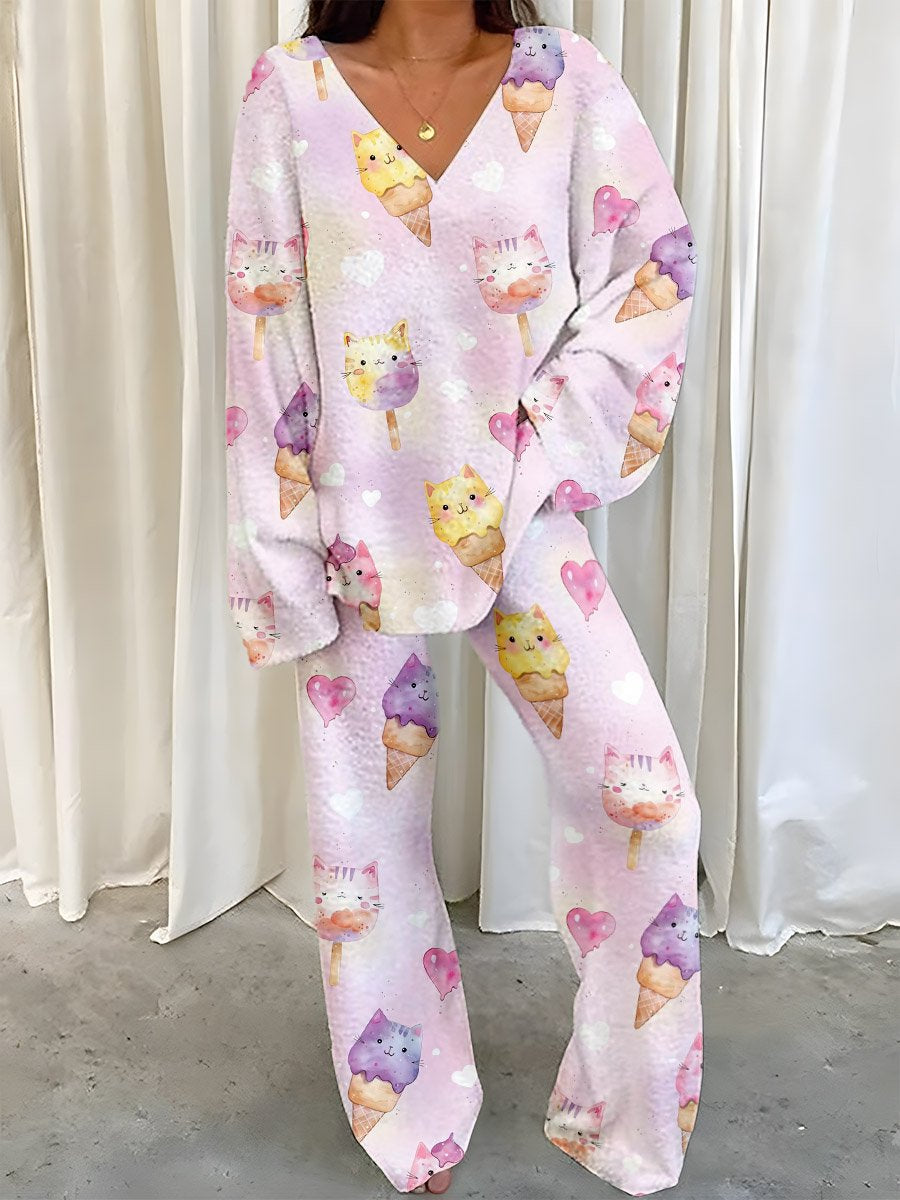 Women's Cute Cat Ice Cream Print V-Neck Polar Fleece Suit