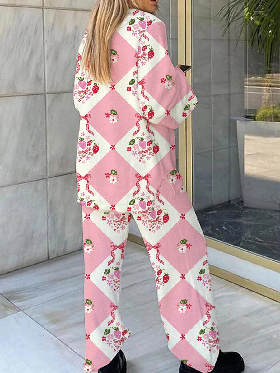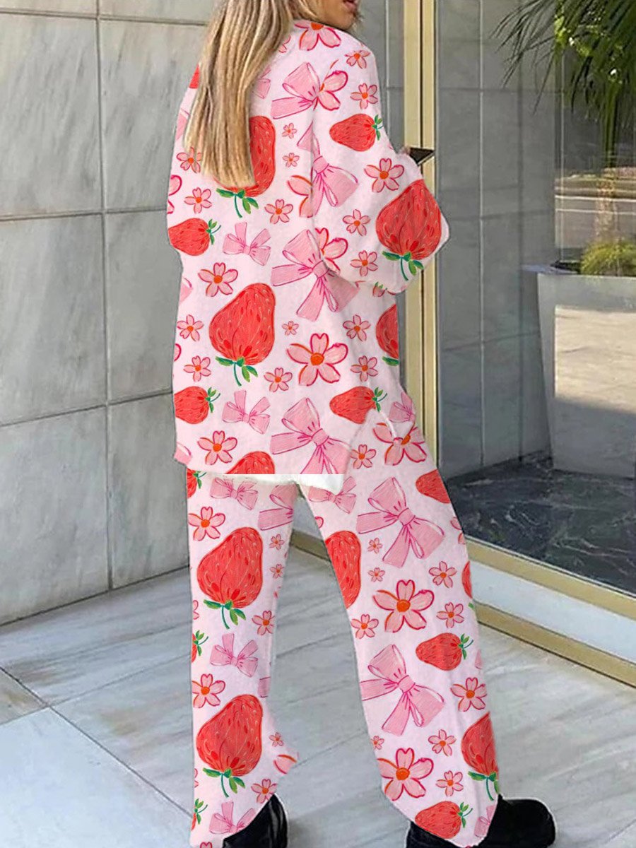 Women's Bow Strawberry Pattern V-Neck Long Sleeve Pants Suit