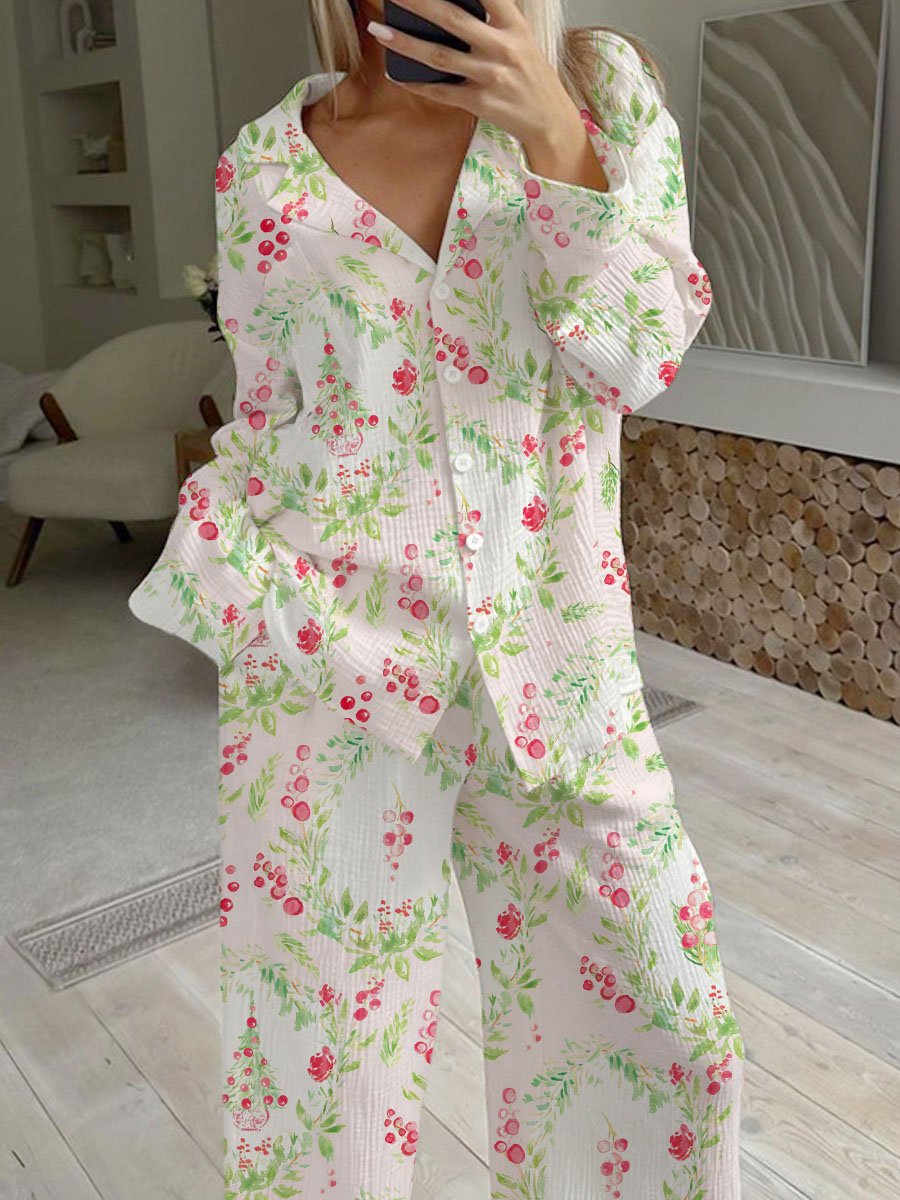 Women's Christmas Tree Plant Fruit Print Loose Homewear Set