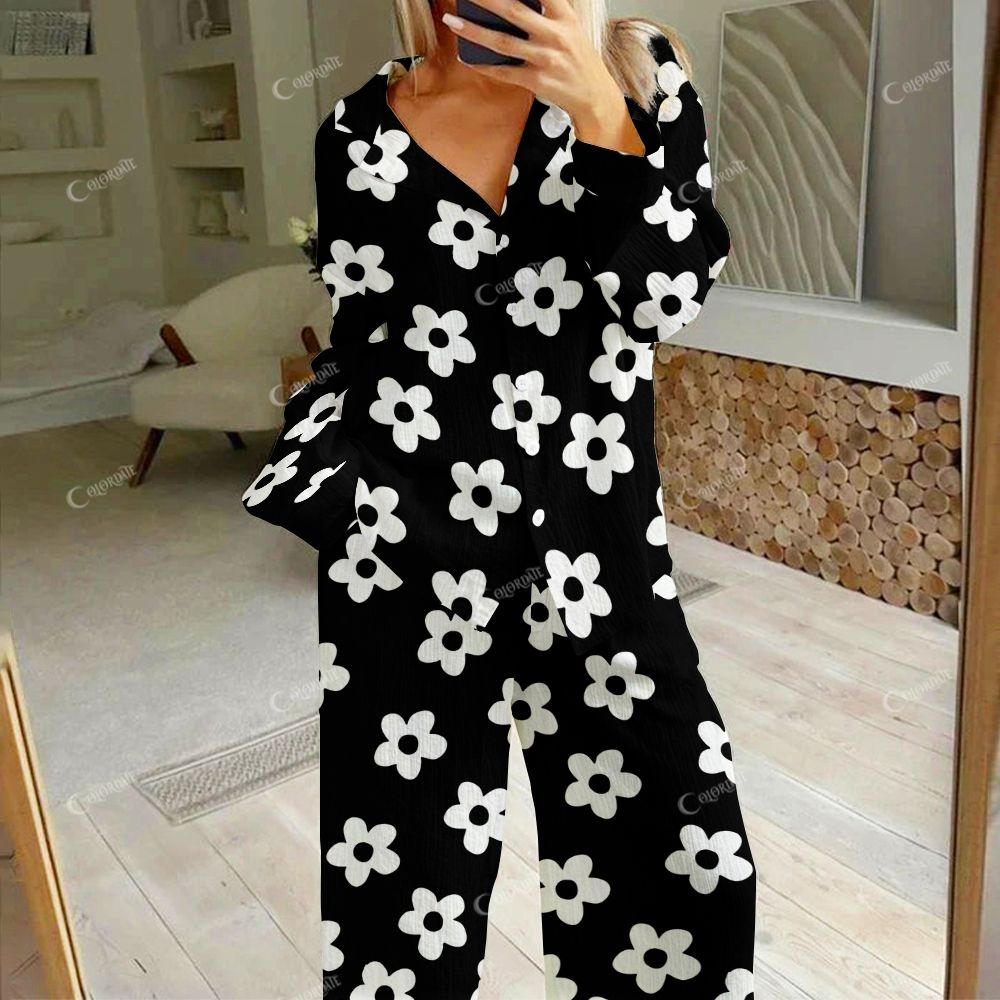 Women's Black Chic Small Flowers Print Cotton Cardigan Homewear Set