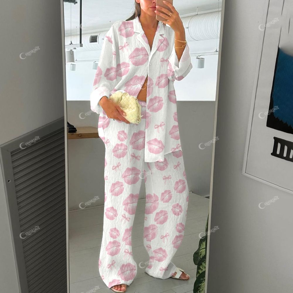 Women's Baby Pink Lip Print Cotton Cardigan Homewear Set