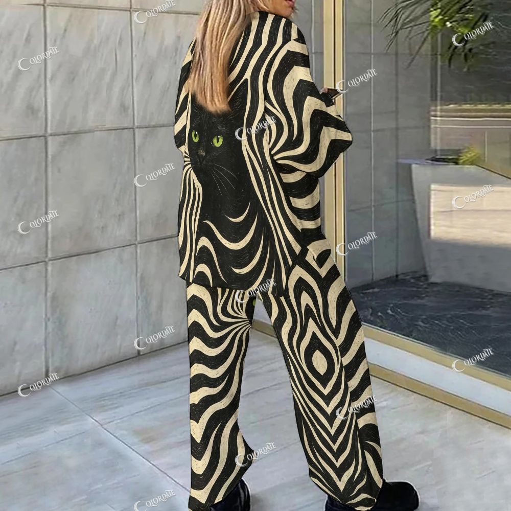 Black Cat Swirl Print Loungewear Set For Women