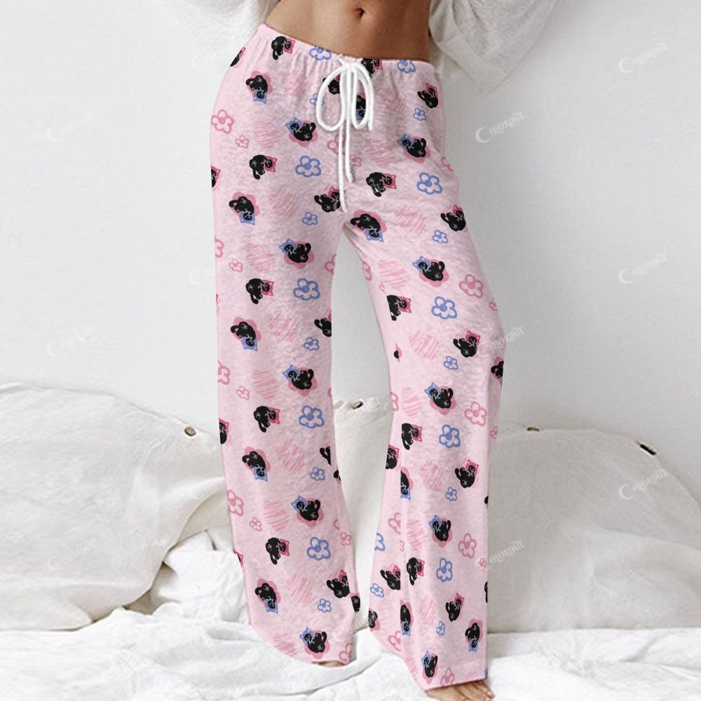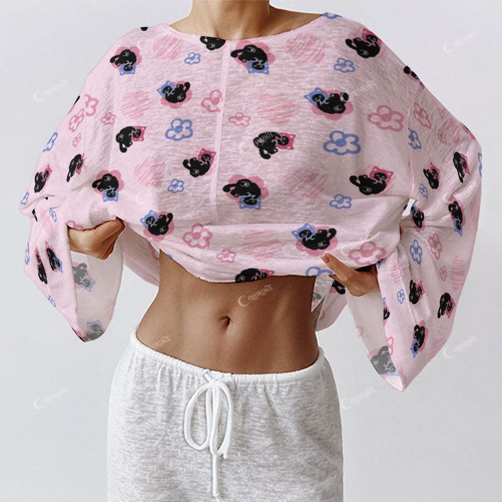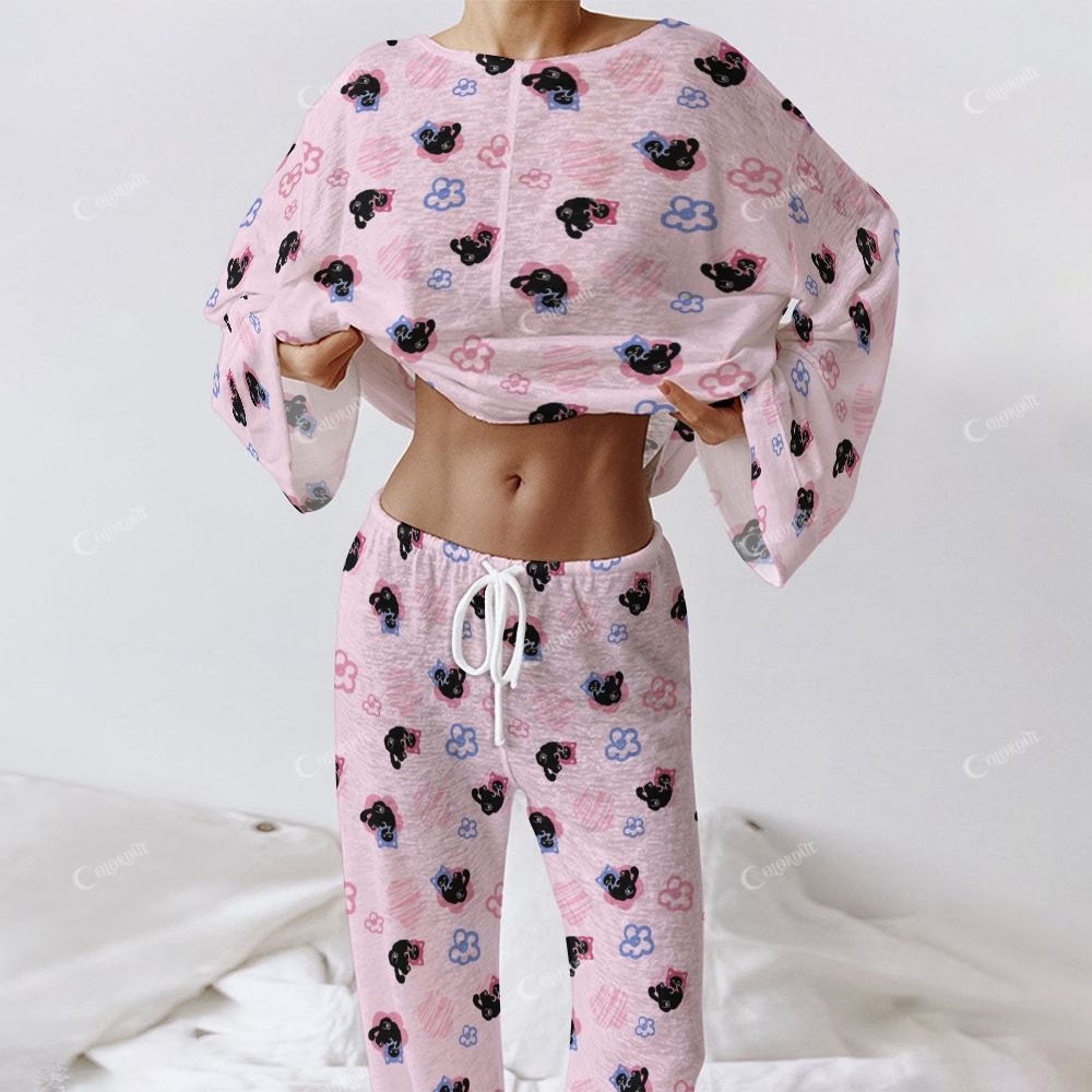 Colordate Women's Black Kitten Print Long Sleeve Cotton Homewear Set
