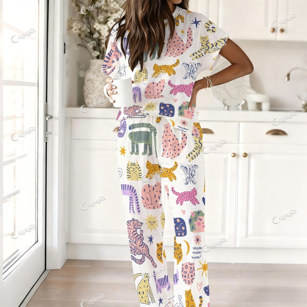 Whimsical Cat Cartoon Print Ladies Lounge Suit