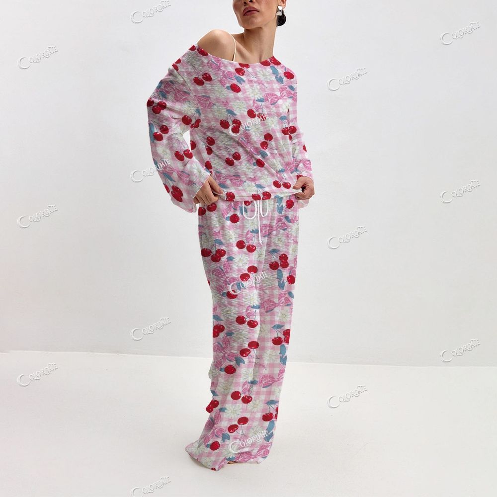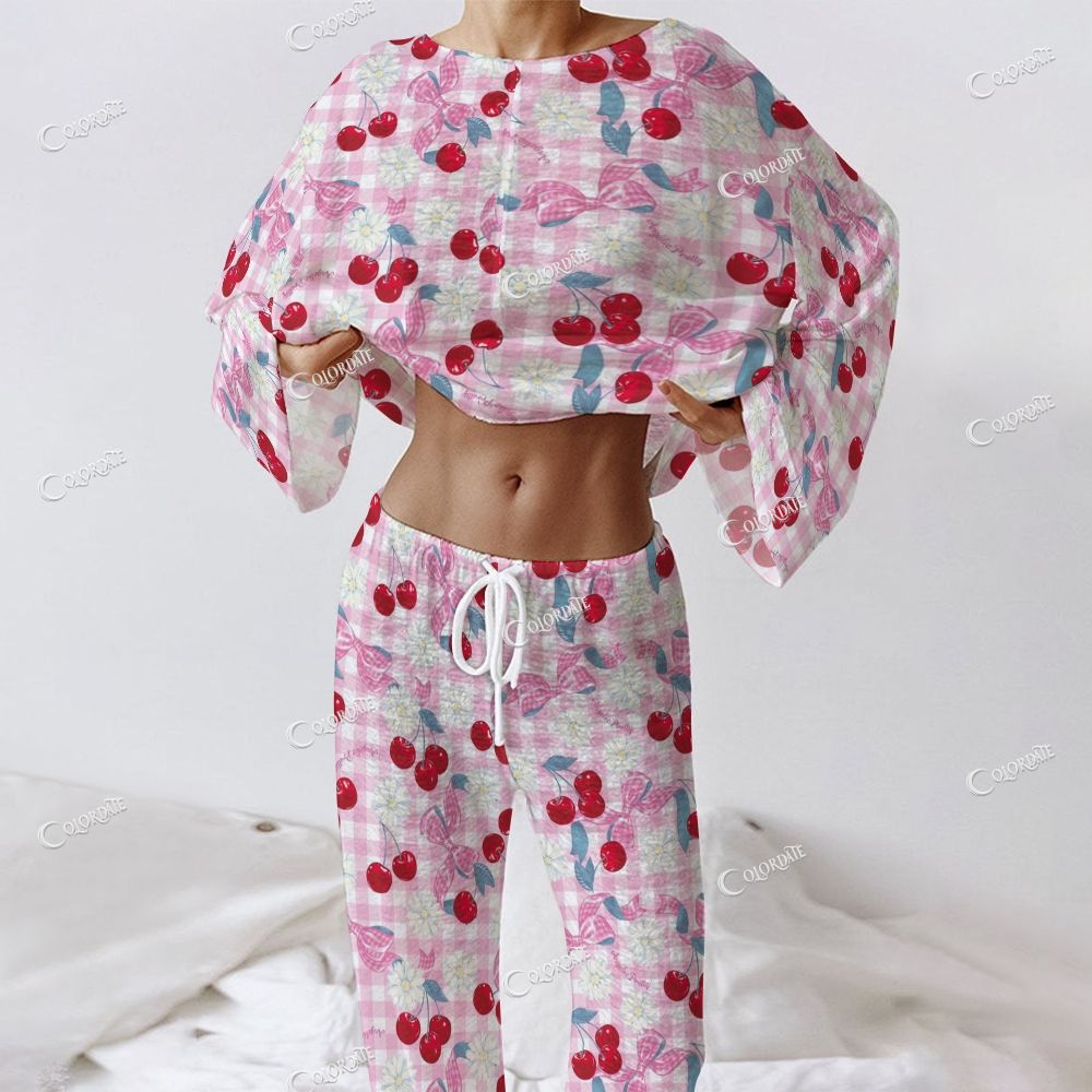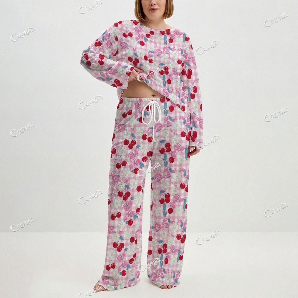Women's Cherry Gingham Print Long Sleeve Cotton Homewear Set