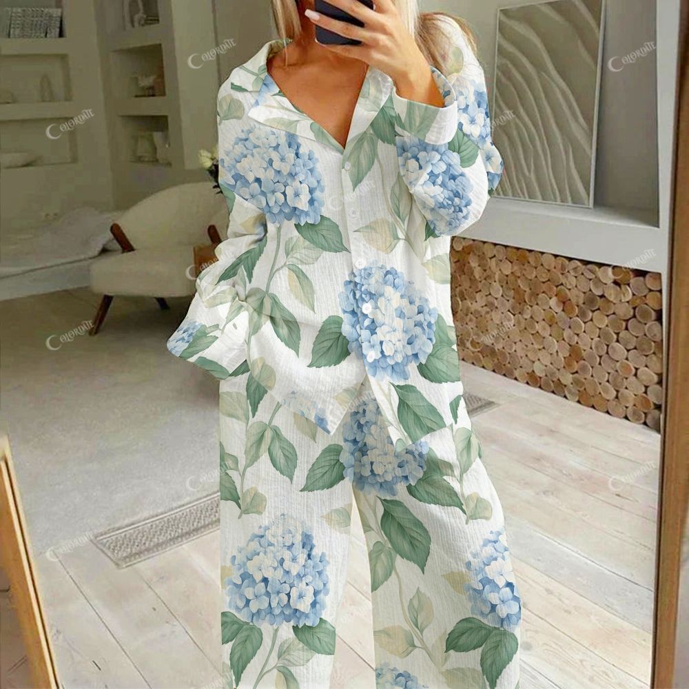 Women's Chic Retro Hydrangea Print Cotton Cardigan Homewear Set