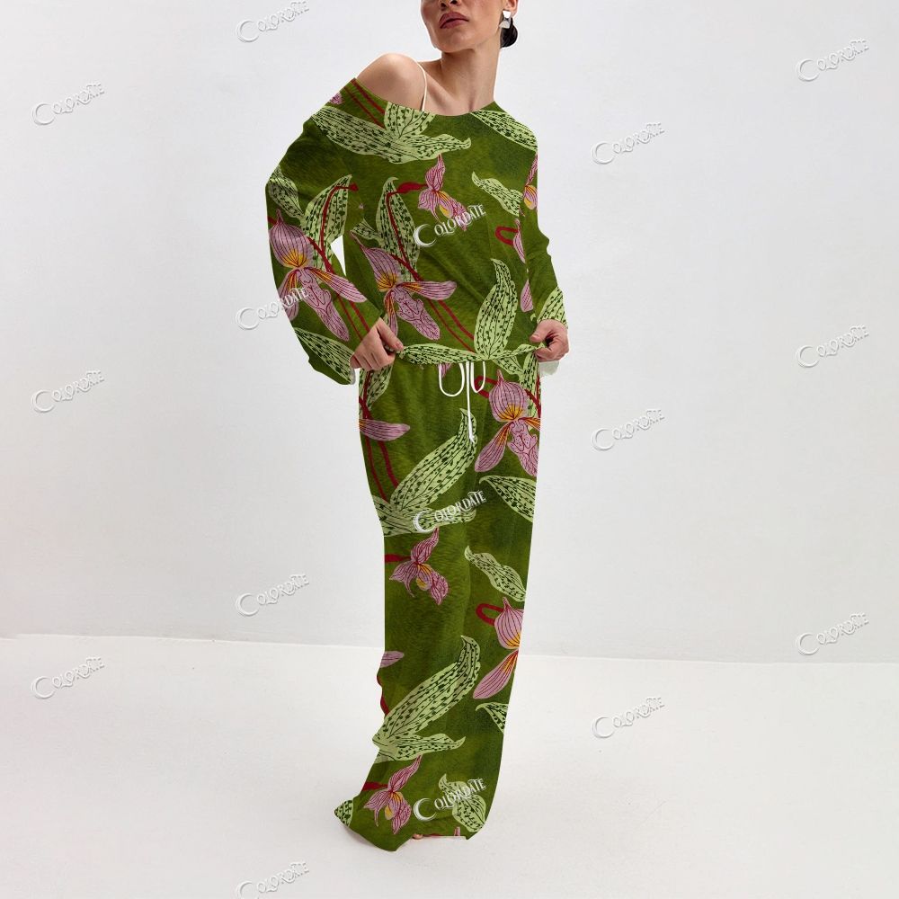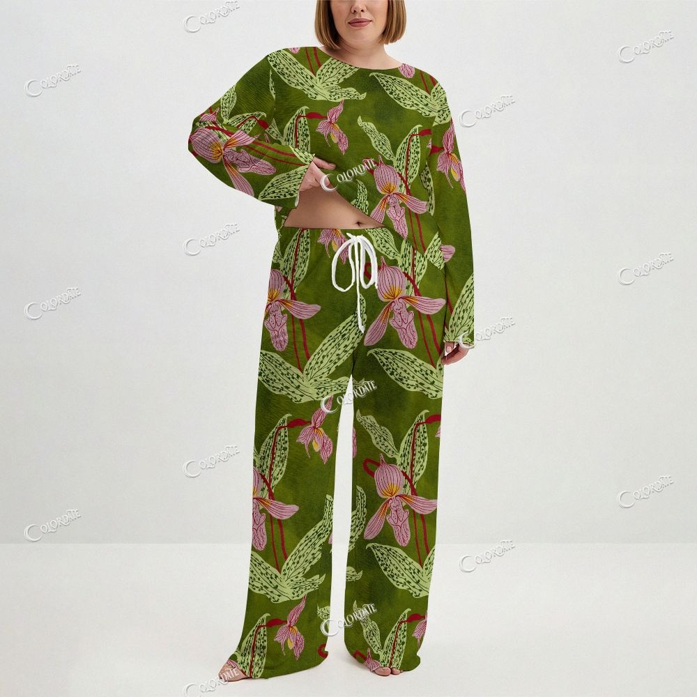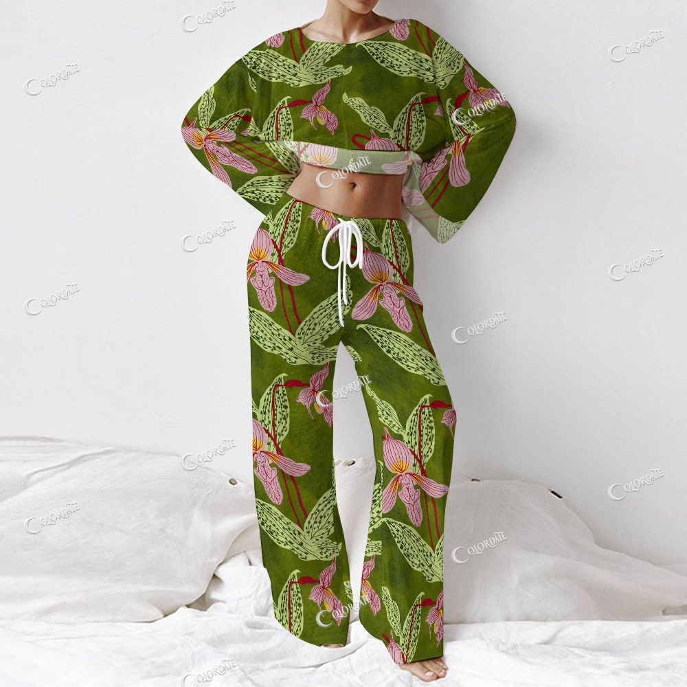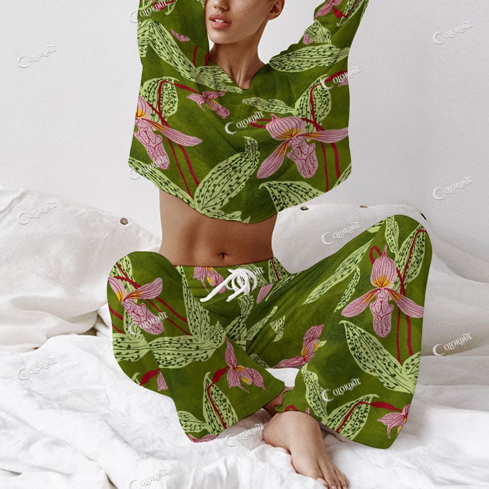 Women's Green Orchid Print Long Sleeve Cotton Homewear Set