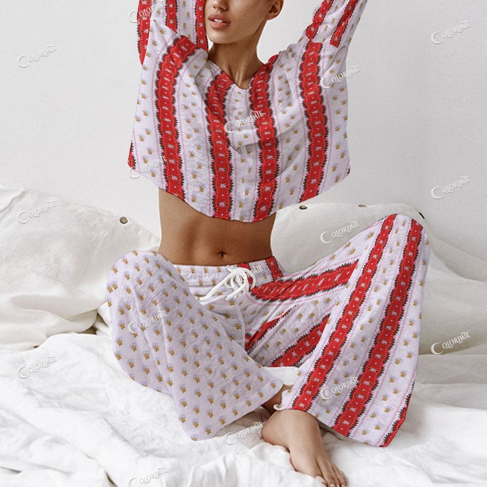 Women's Red Geometric Wave Stripe And Flower Long Sleeve Cotton Homewear Set