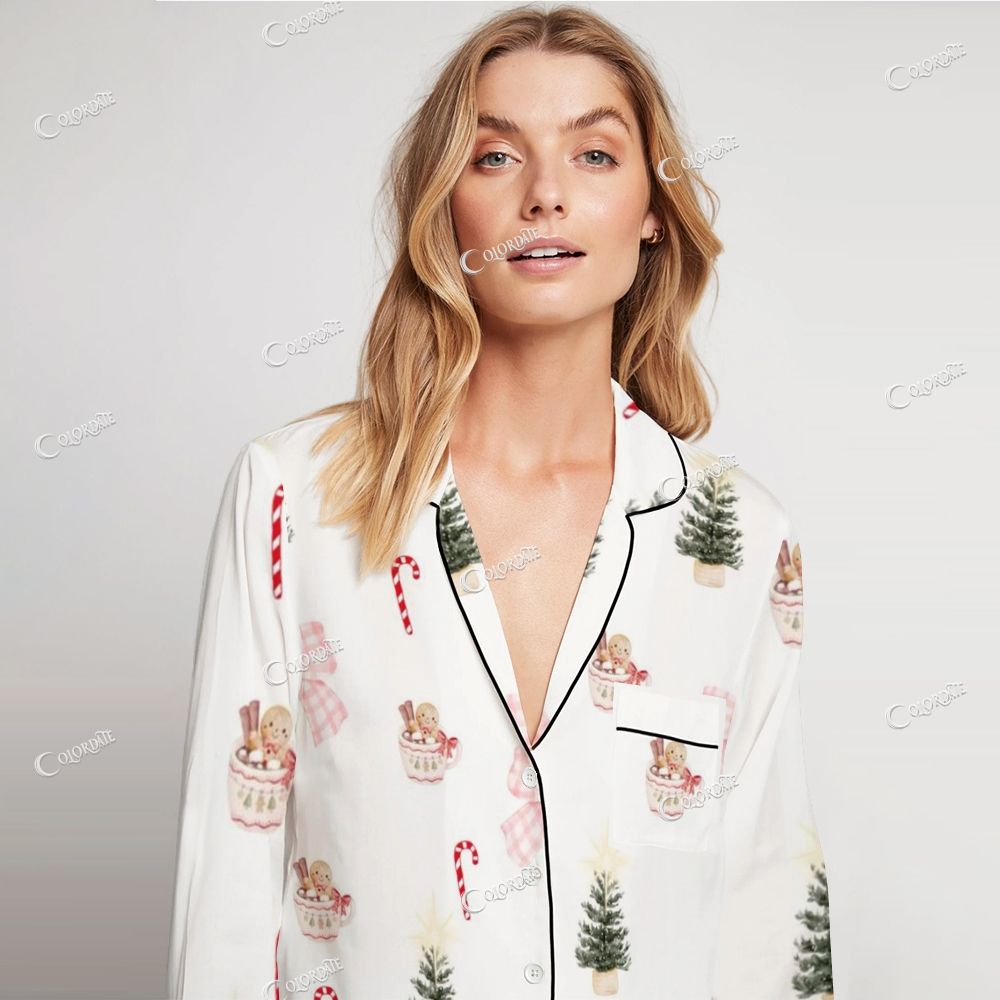 Women's White Base Green Pine Tree Print Home Long Sleeve Suit