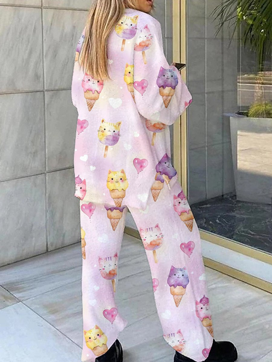 Women's Cute Cat Ice Cream Print V-Neck Polar Fleece Suit