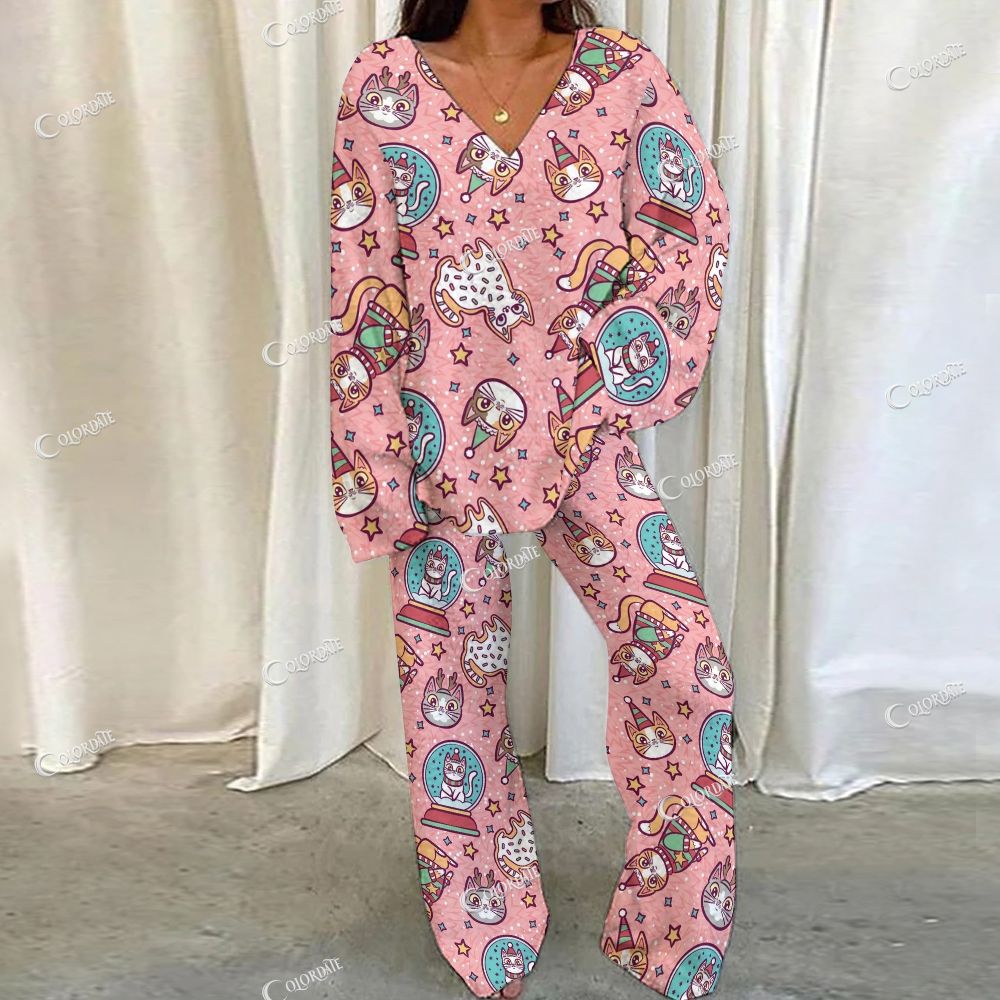 Festive Cat Print Loungewear Set For Women