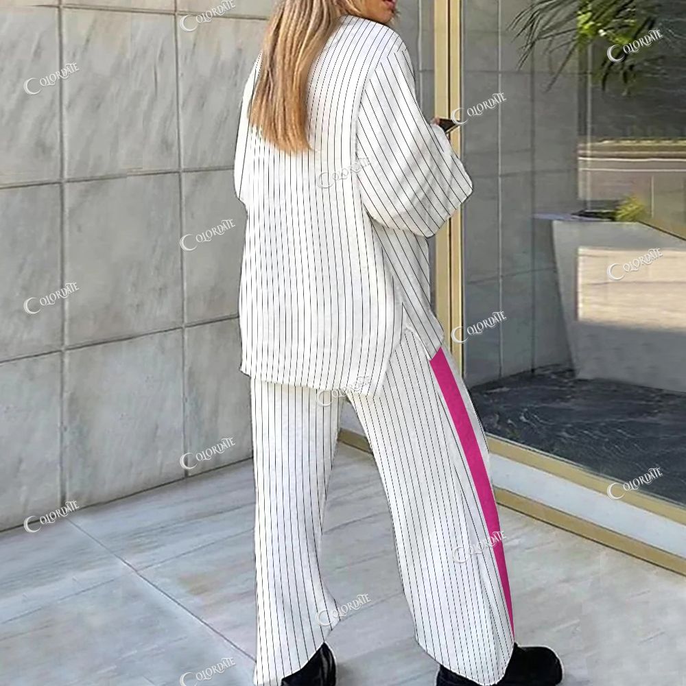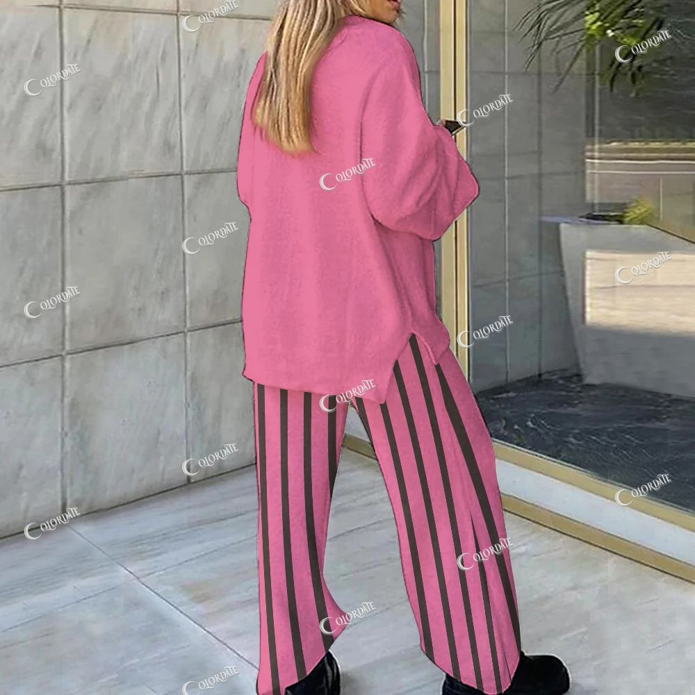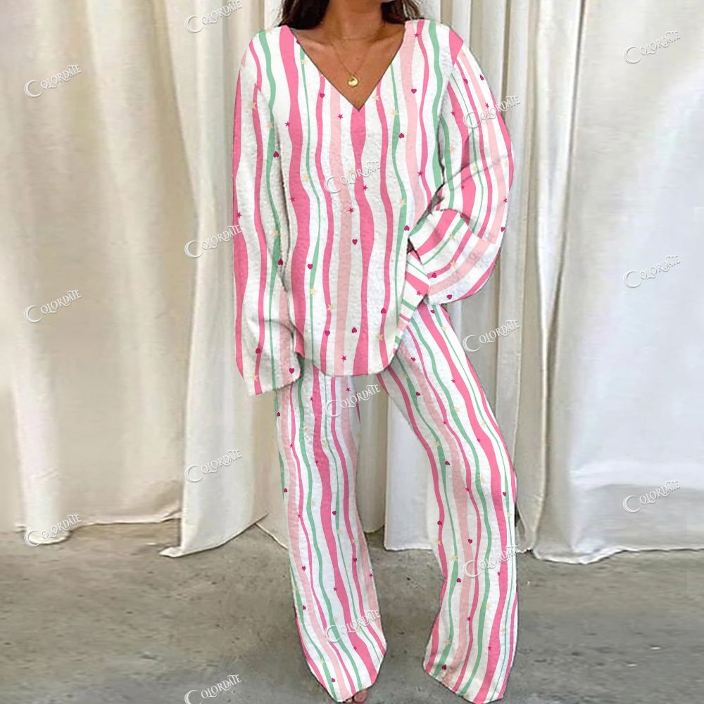 Pink & Green Stripe Print Loungewear Set For Women