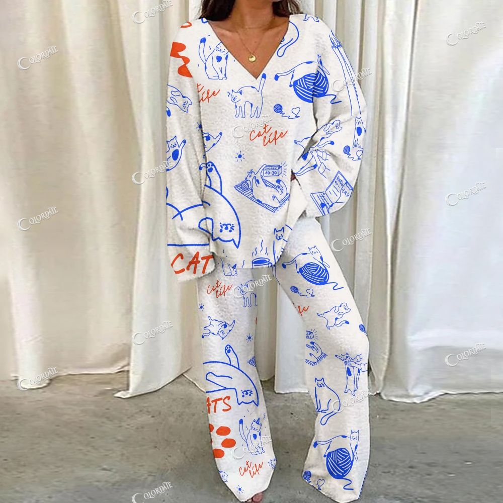 Scribble Cat Print Loungewear Set For Women