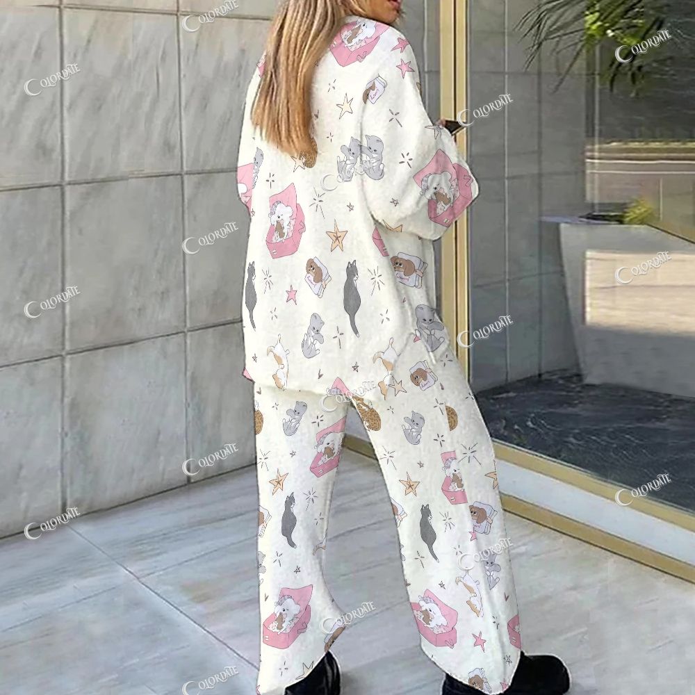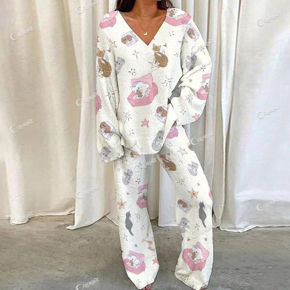 21Cute Cat Print Loungewear Set For Women