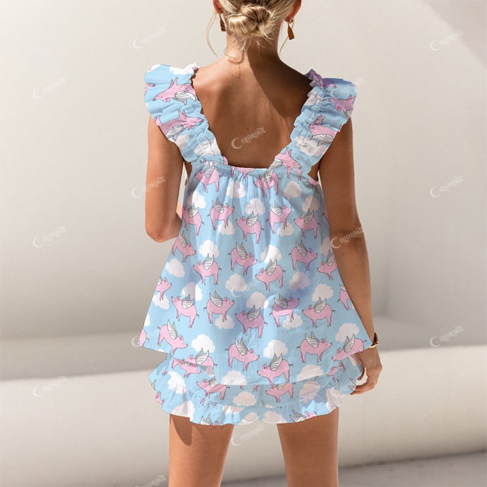 Colordate Little Flying Pig Print Short Tank Top Shorts Pajama Set