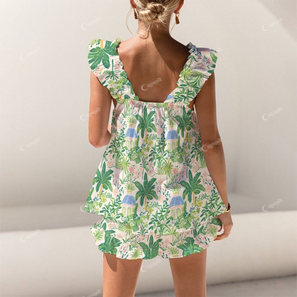 Crafted from featherlight fabric that floats over your skin like moonbeams, this ethereal set keeps you cool while the French-seam construction ensures graceful drape. The ruffled straps allow for a perfect fit, while the scalloped trimmed shorts offer playful elegance with every step.