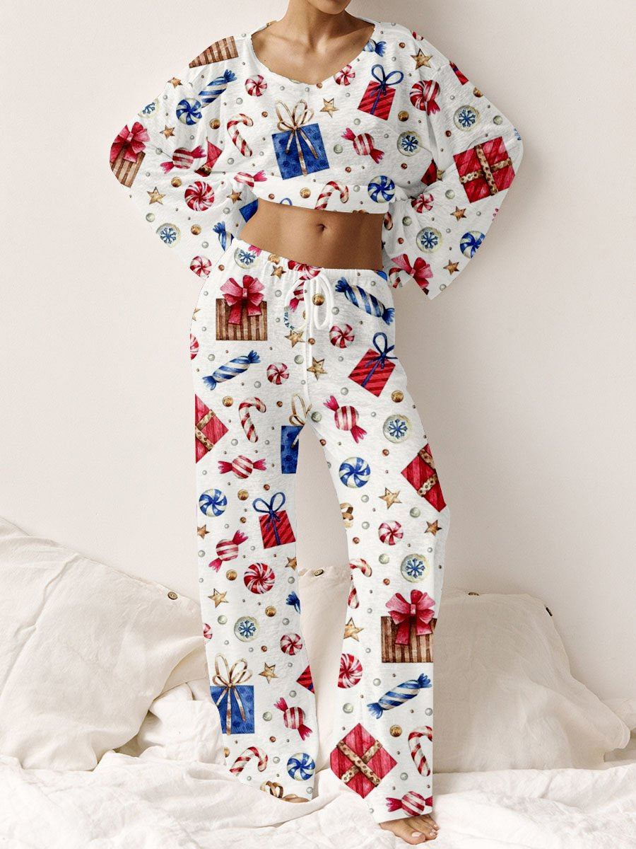 Women's Christmas Gift Box Watercolor Print V-Neck Polar Fleece Suit