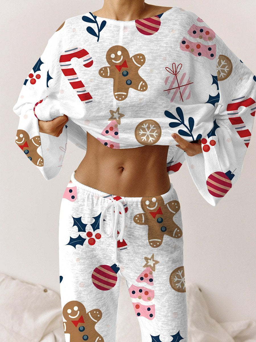 Women's Christmas Gingerbread Candy Print Long Sleeve Loose Pajama Set