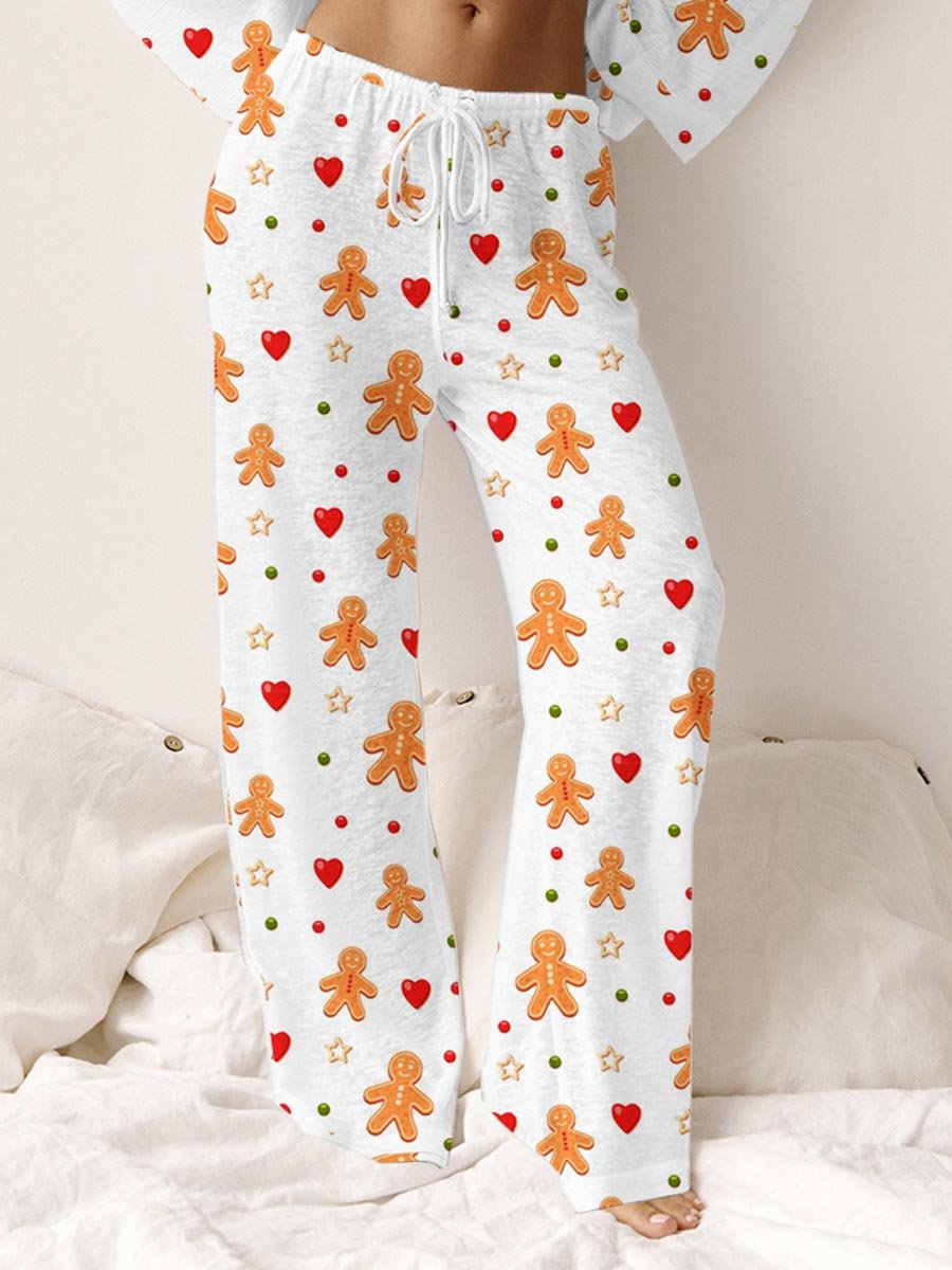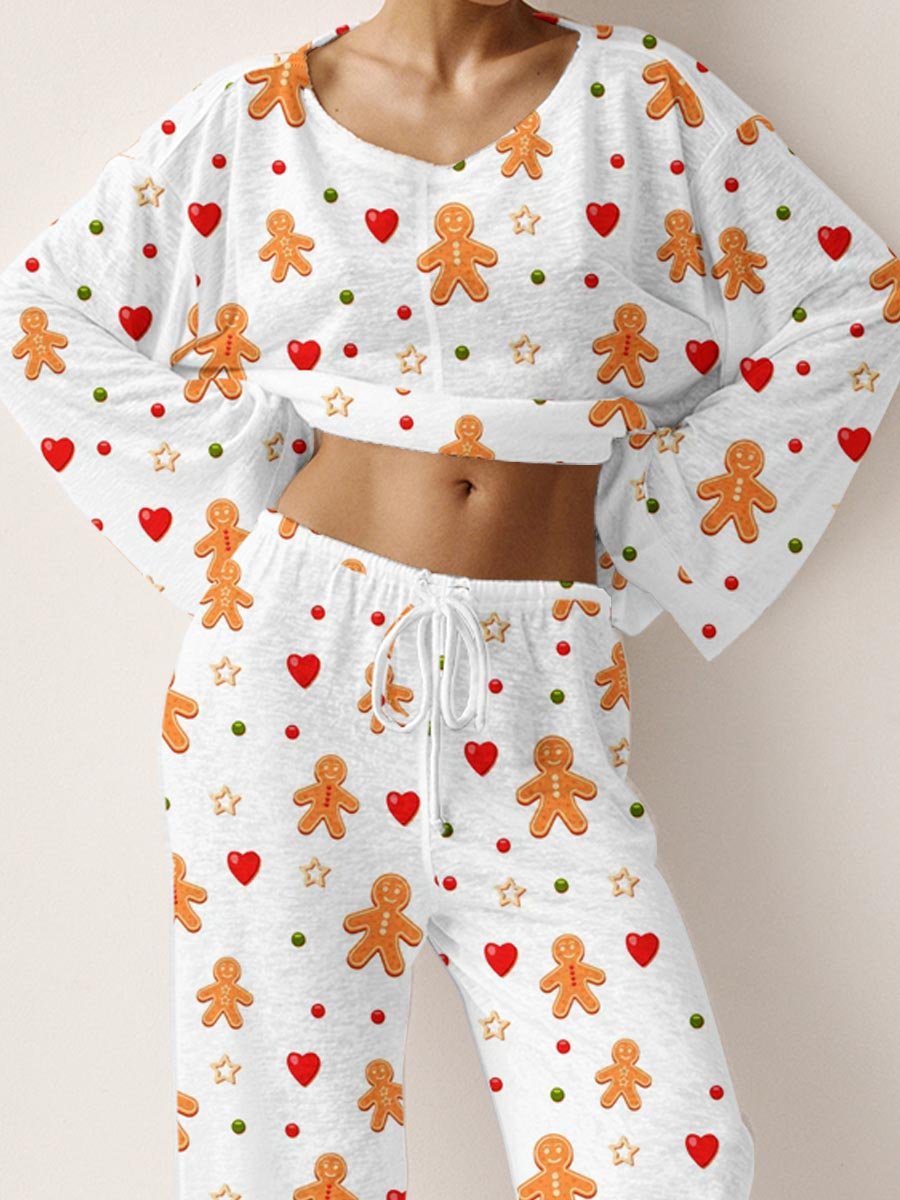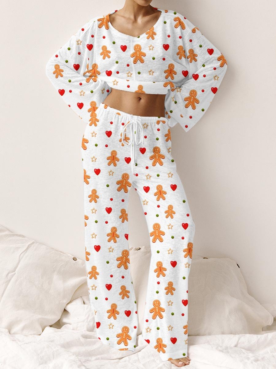 Women's Christmas Gingerbread Man Pattern Heart Long Sleeve Set