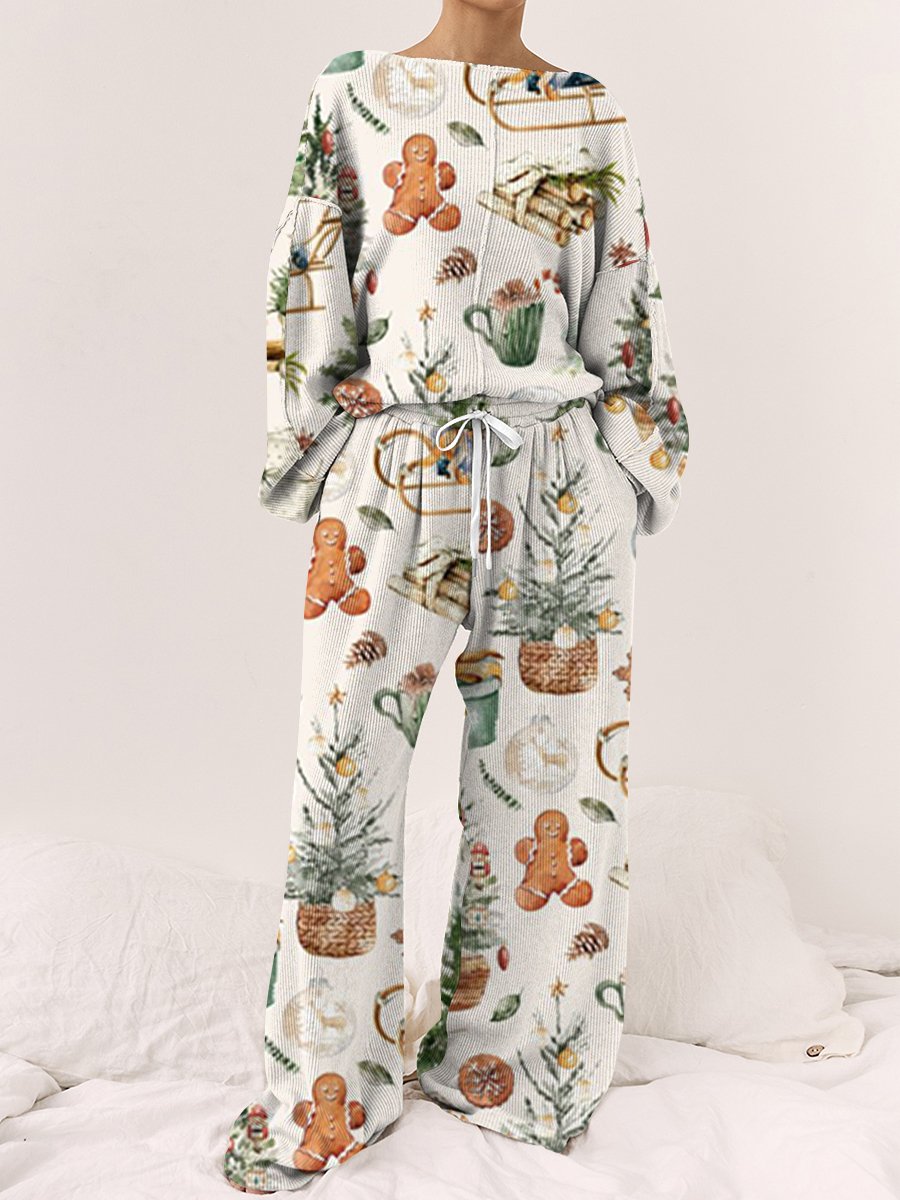 Women's Christmas Gingerbread Man Pattern Long Sleeve Pants Set