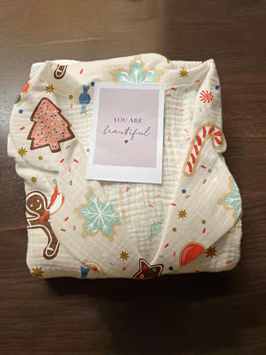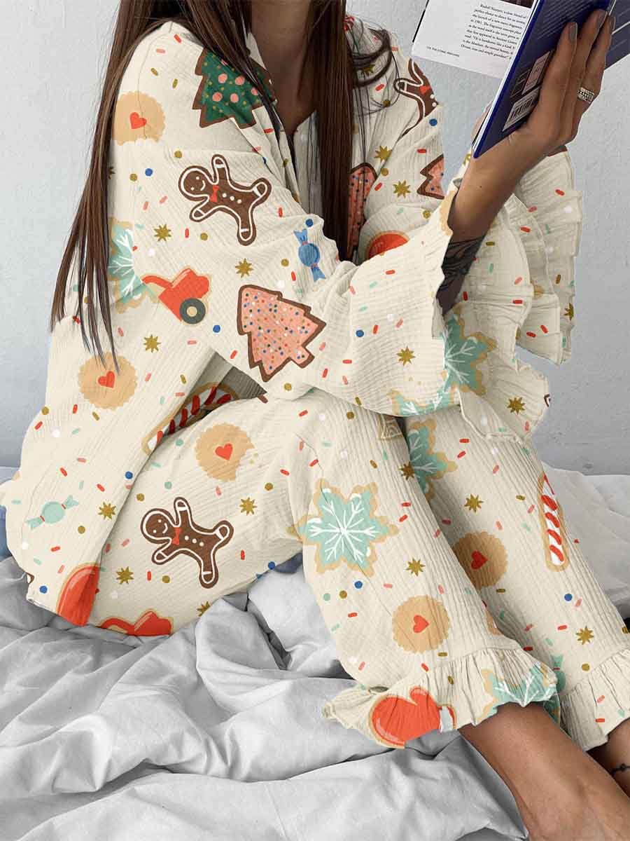 Women's Christmas Gingerbread Man Snowflake Pattern Long Sleeve V-Neck Suit