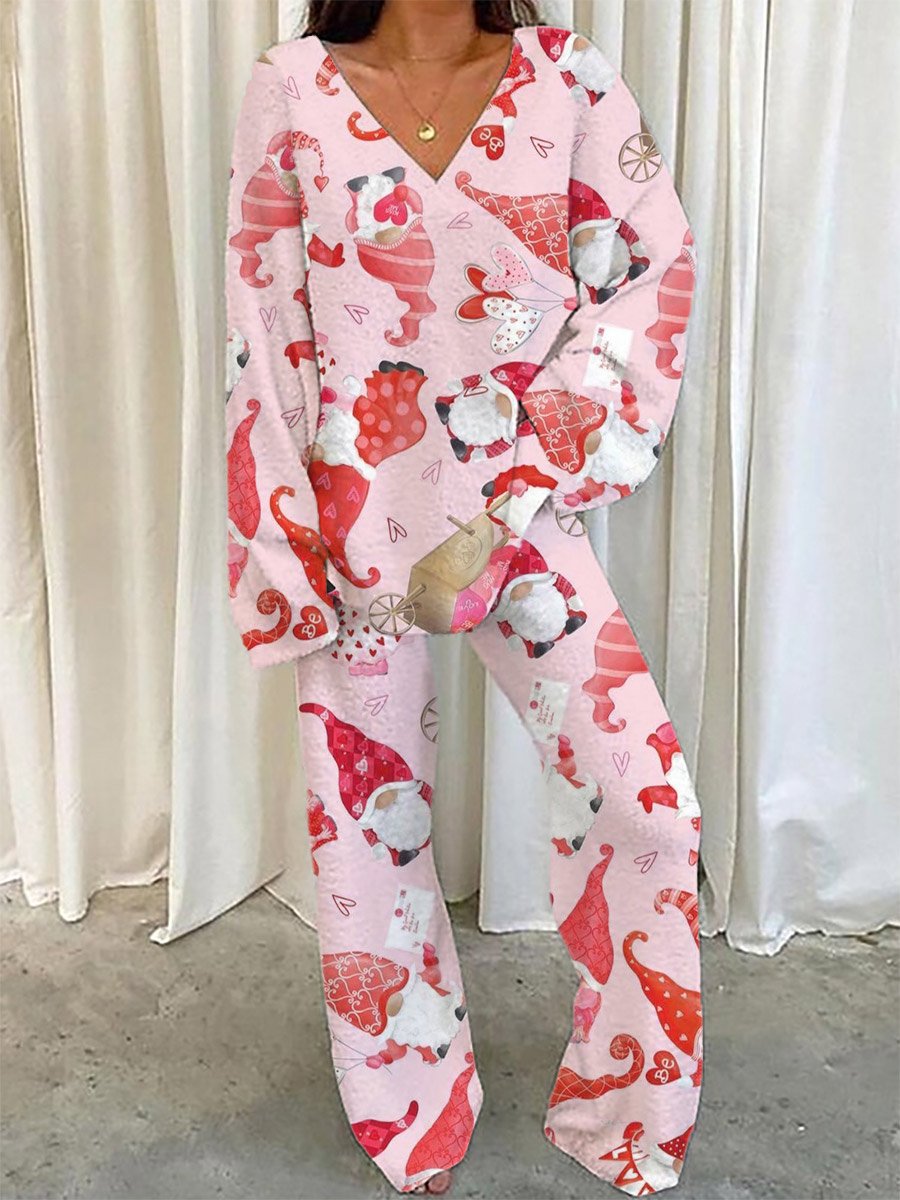 Women's Christmas Gnome Pattern V-Neck Long Sleeve Pants Suit