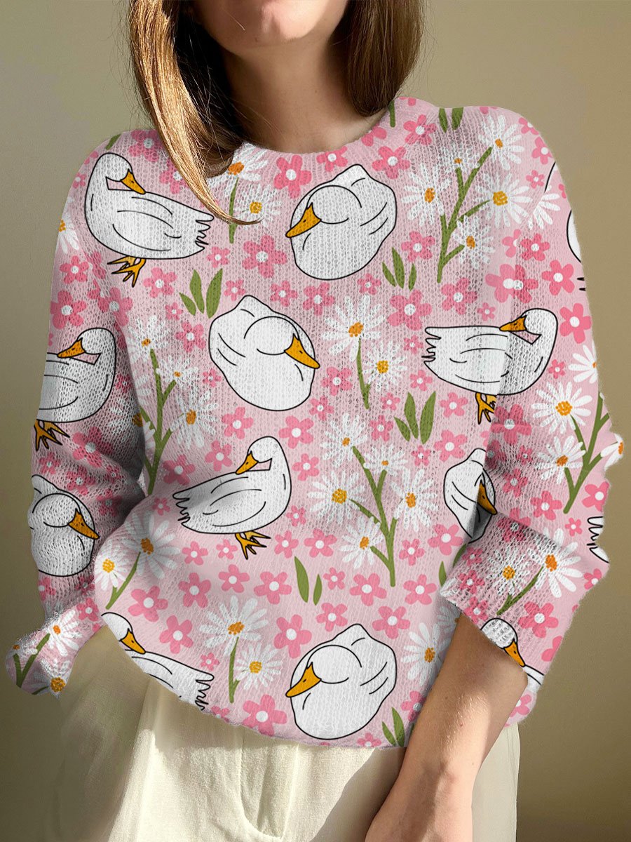 Women's Pink Cute Animal Art Floral Print Home Crew Neck Sweater