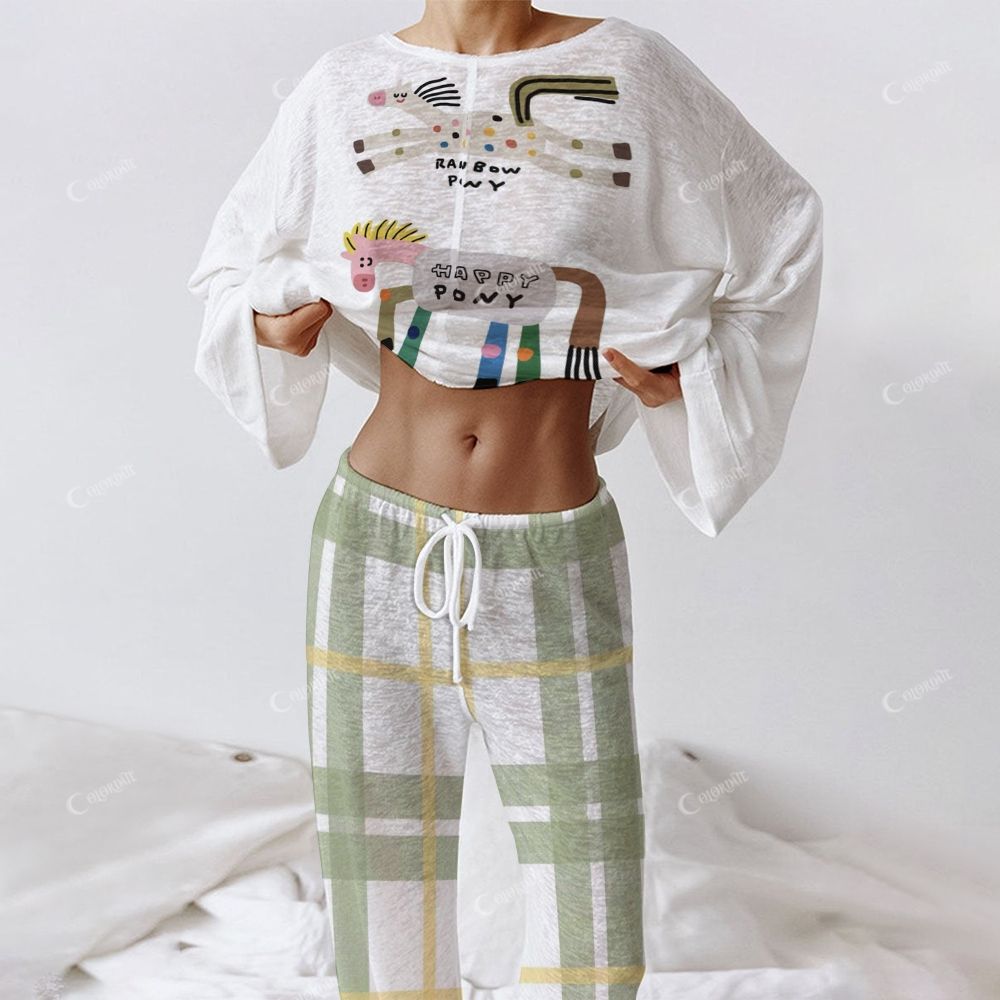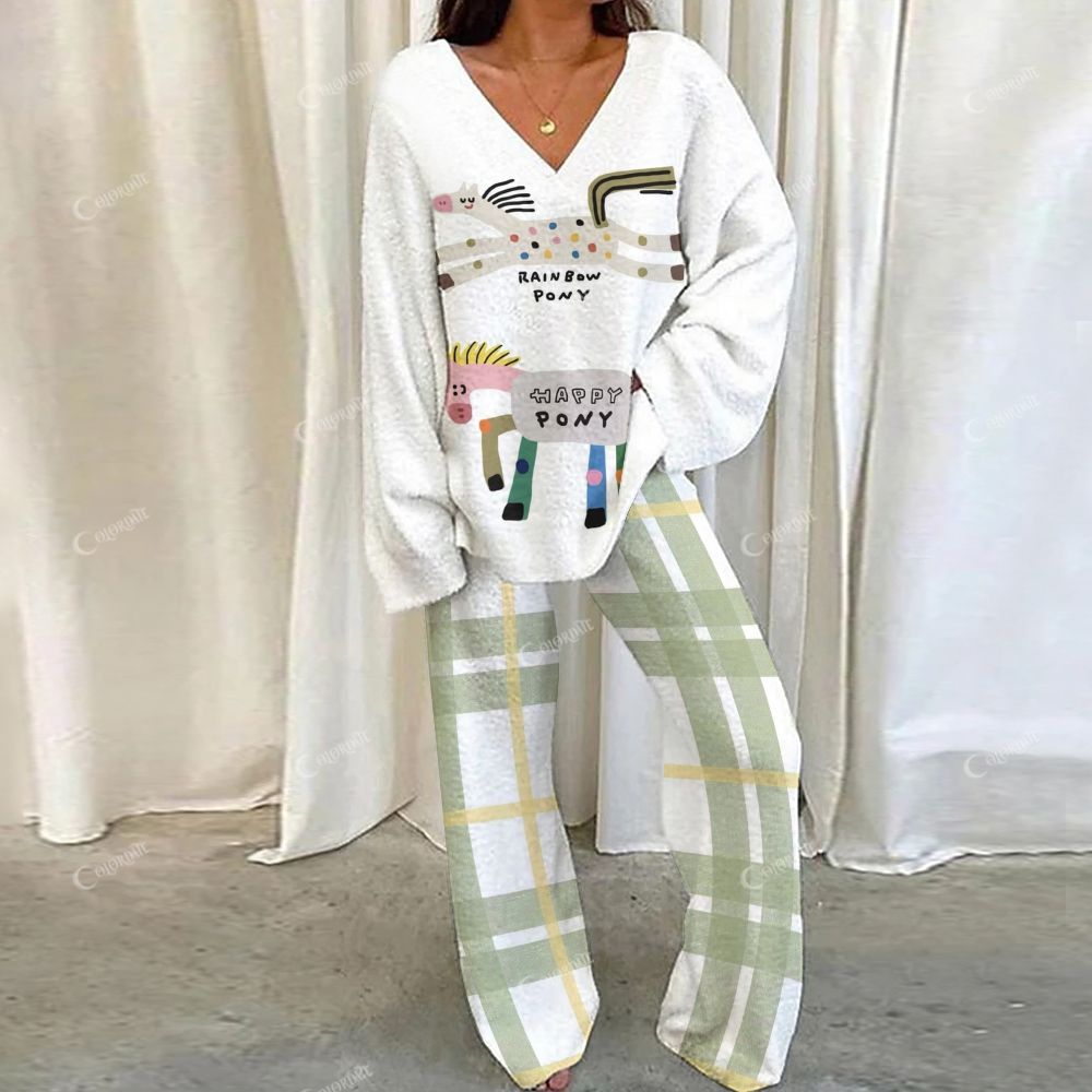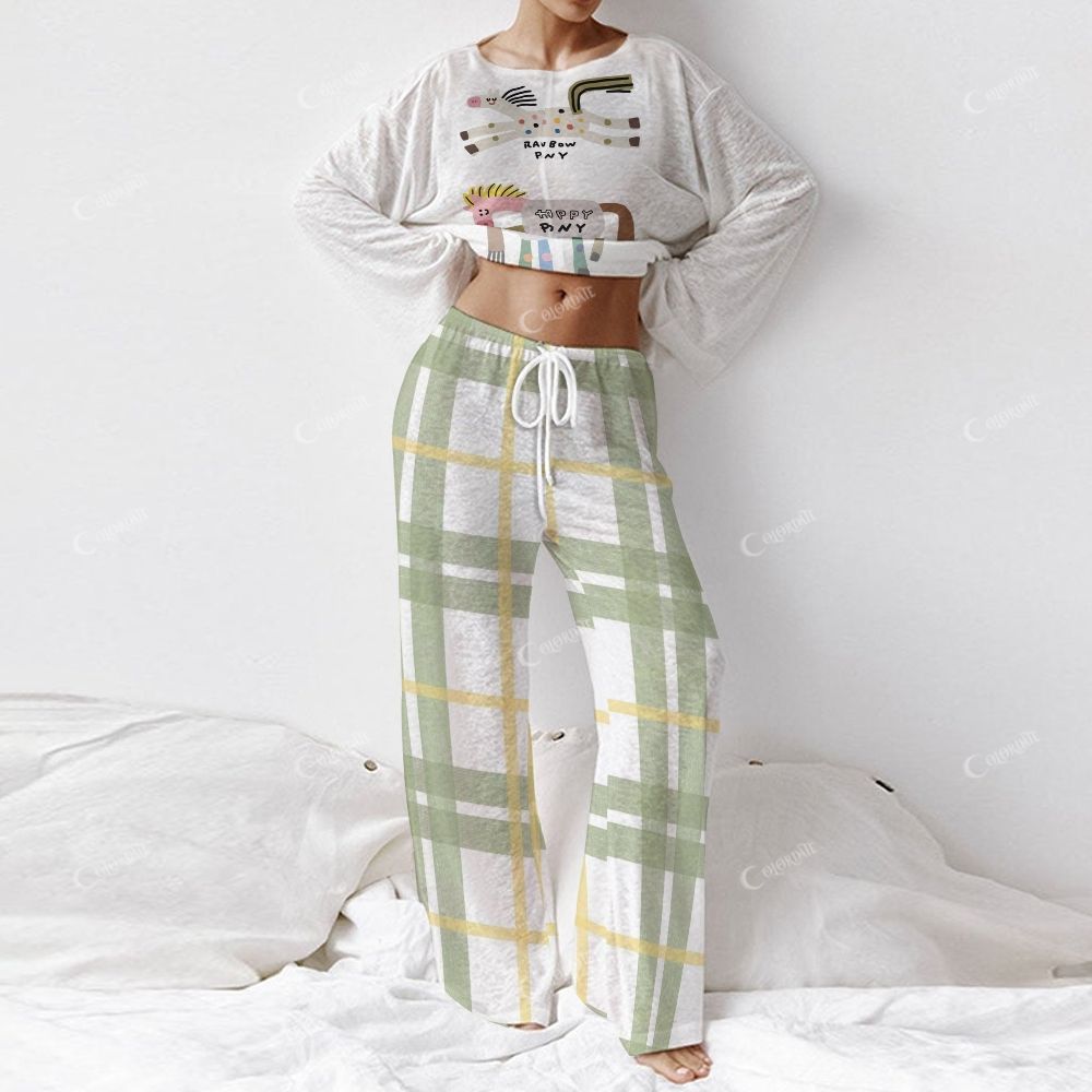 Cartoon Pattern and Green Plaid Loungewear Set For Women