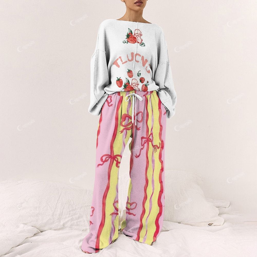 "FLUFFY" and Strawberry Pattern Loungewear Set For Women