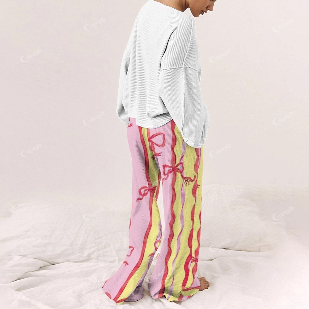 Colordate Women's Red Bow And Candy Cane Print Long Sleeve Cotton Homewear Set