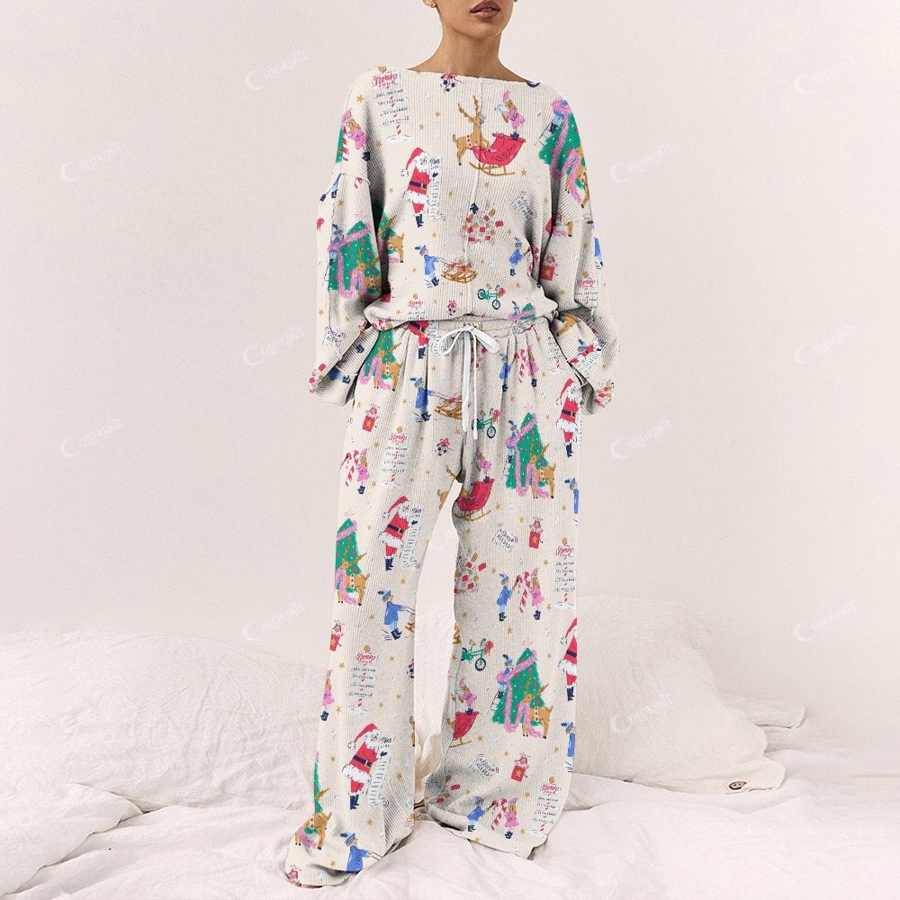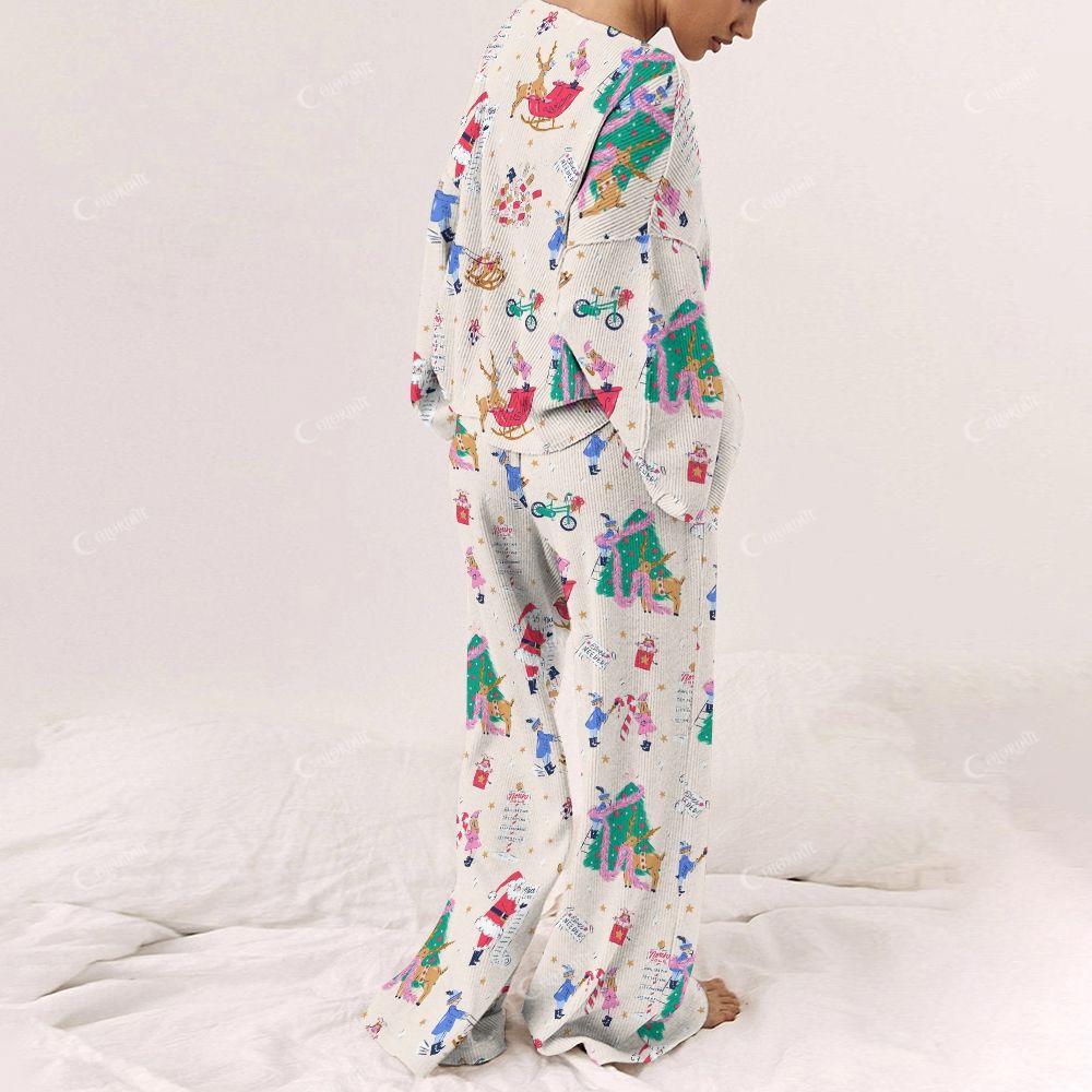 Colordate Women's Simple Christmas Patterns Print Long Sleeve Pajama Set