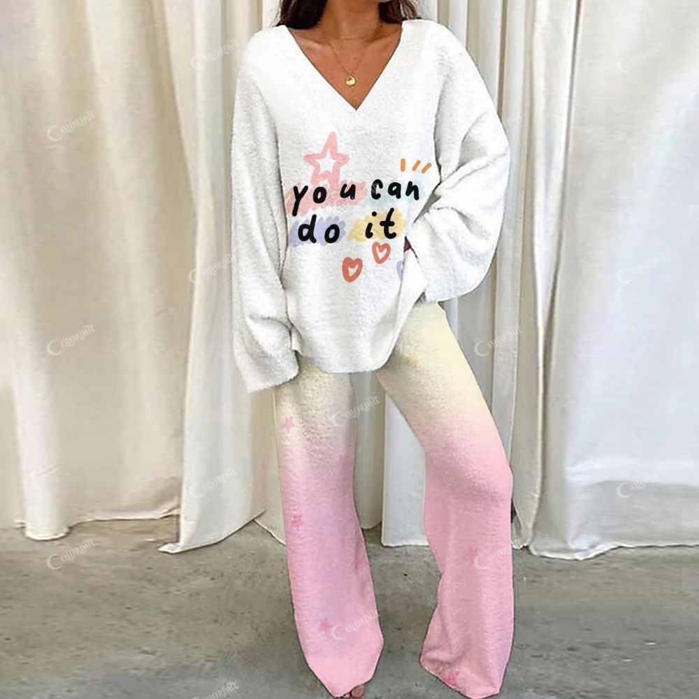 "you can do it" Pattern and Pink-Beige Gradient Loungewear Set For Women