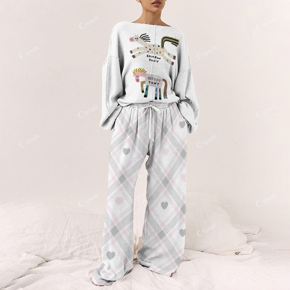 Cartoon Pattern and Light Gray Plaid Women's Print Long Sleeve Pajama Set