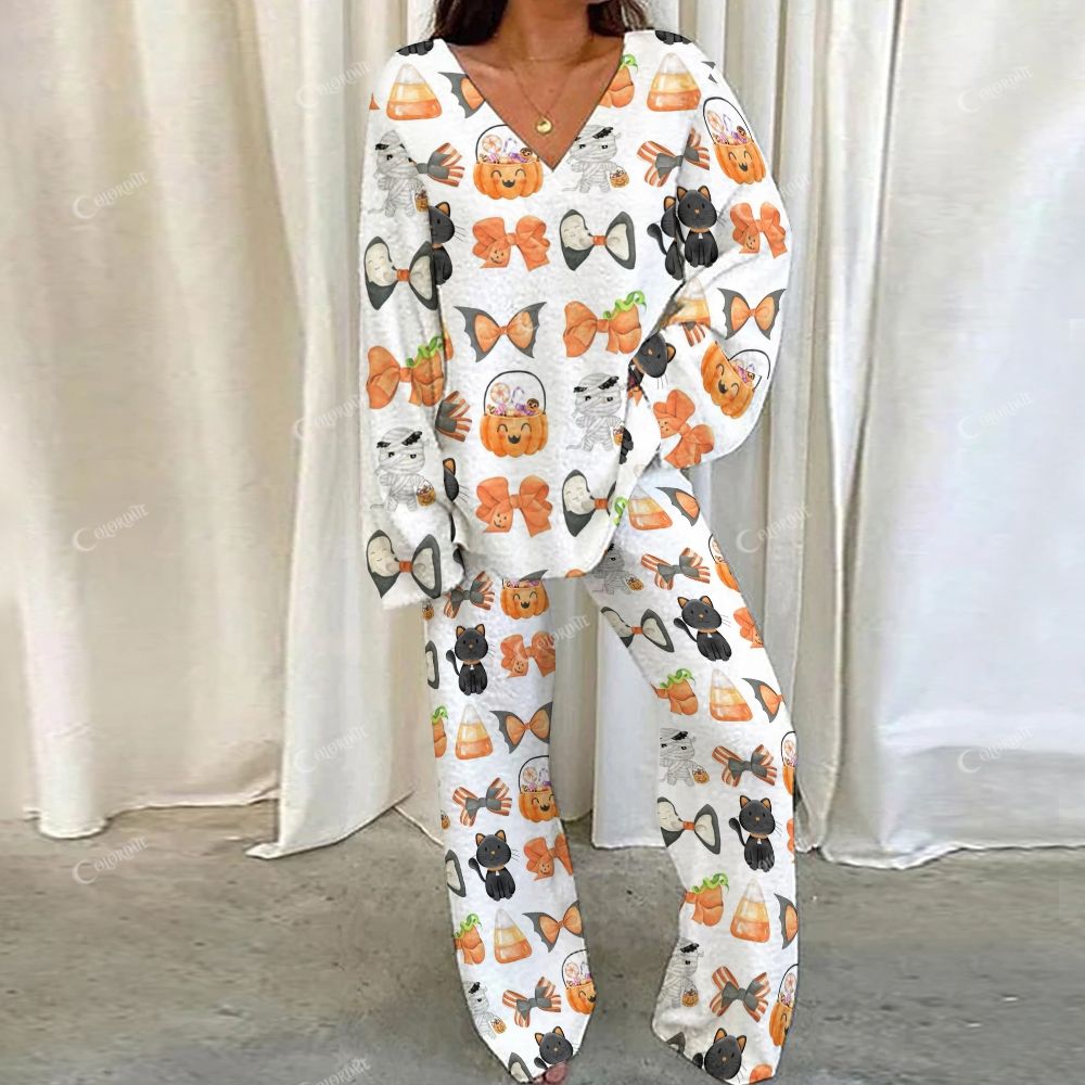 Colordate Halloween Bows And Pumpkin Prints Loungewear Set For Women