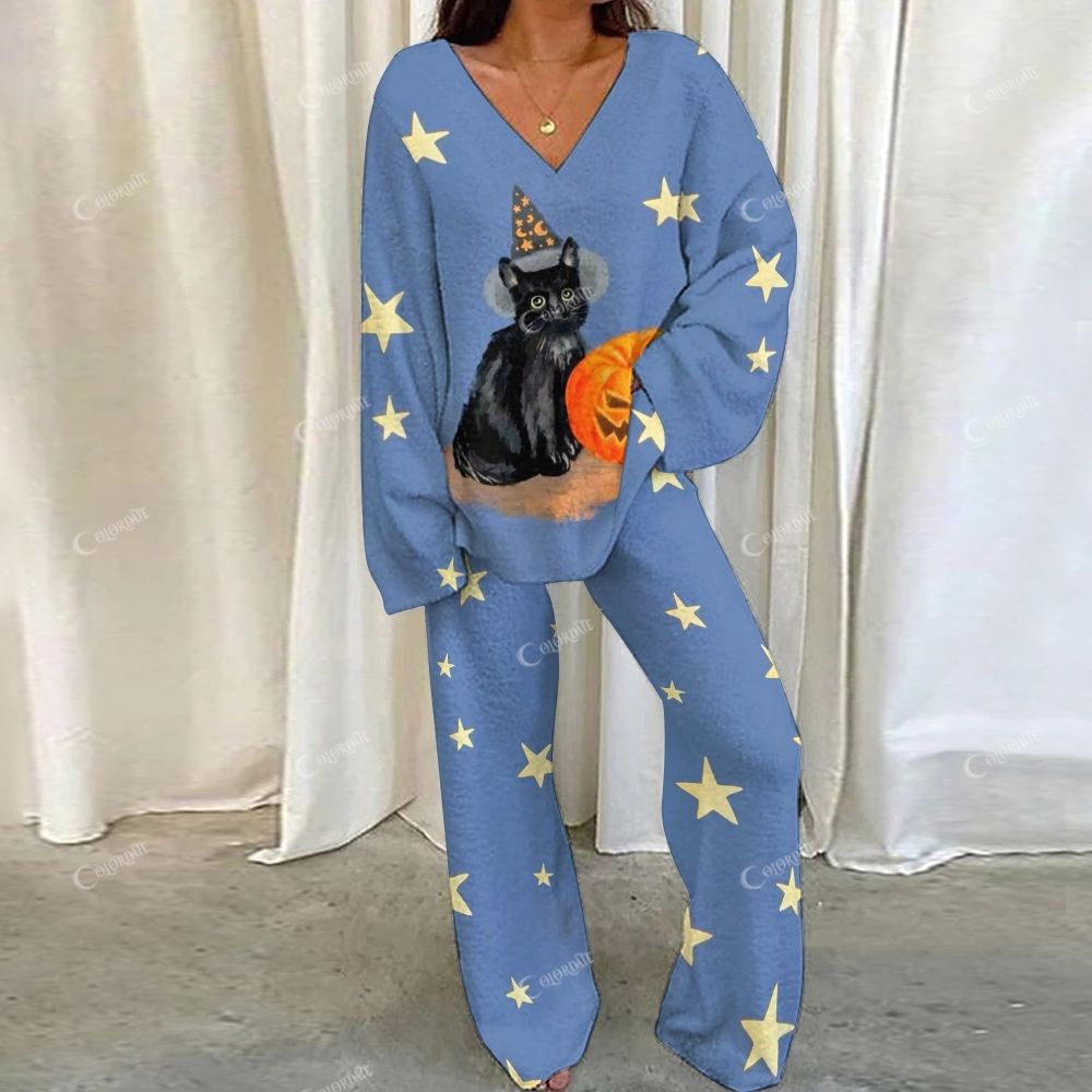 Colordate Halloween Kitten Print Loungewear Set For Women