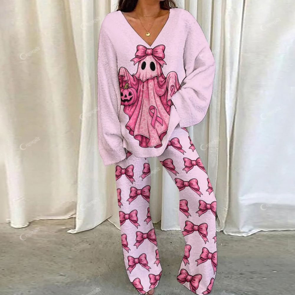 Colordate Pink Ghost And Bow Print Loungewear Set For Women