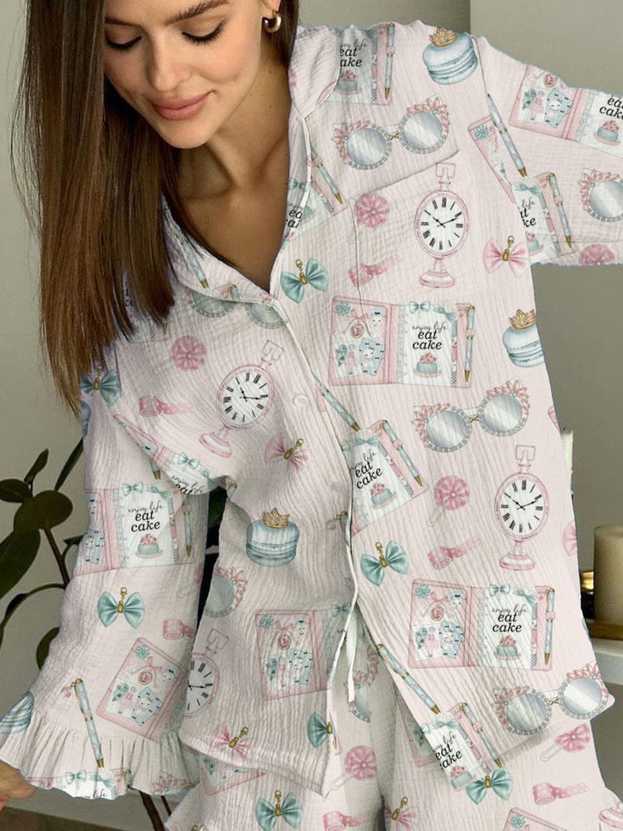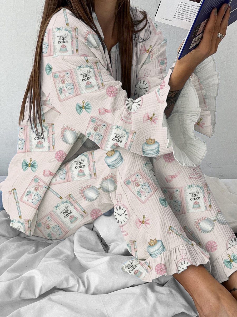Women's Pink Casual Pattern Ruffle Long Sleeve Pants Set