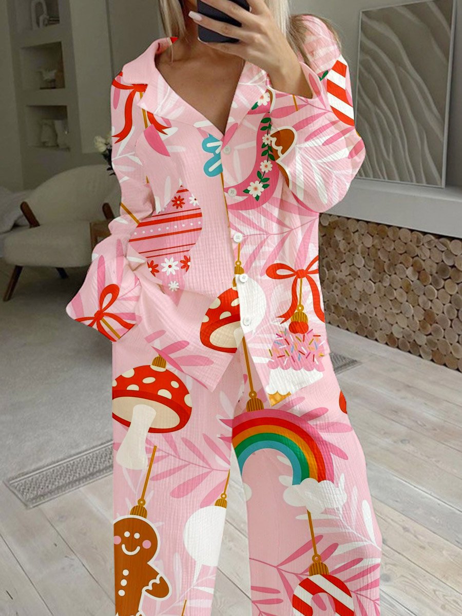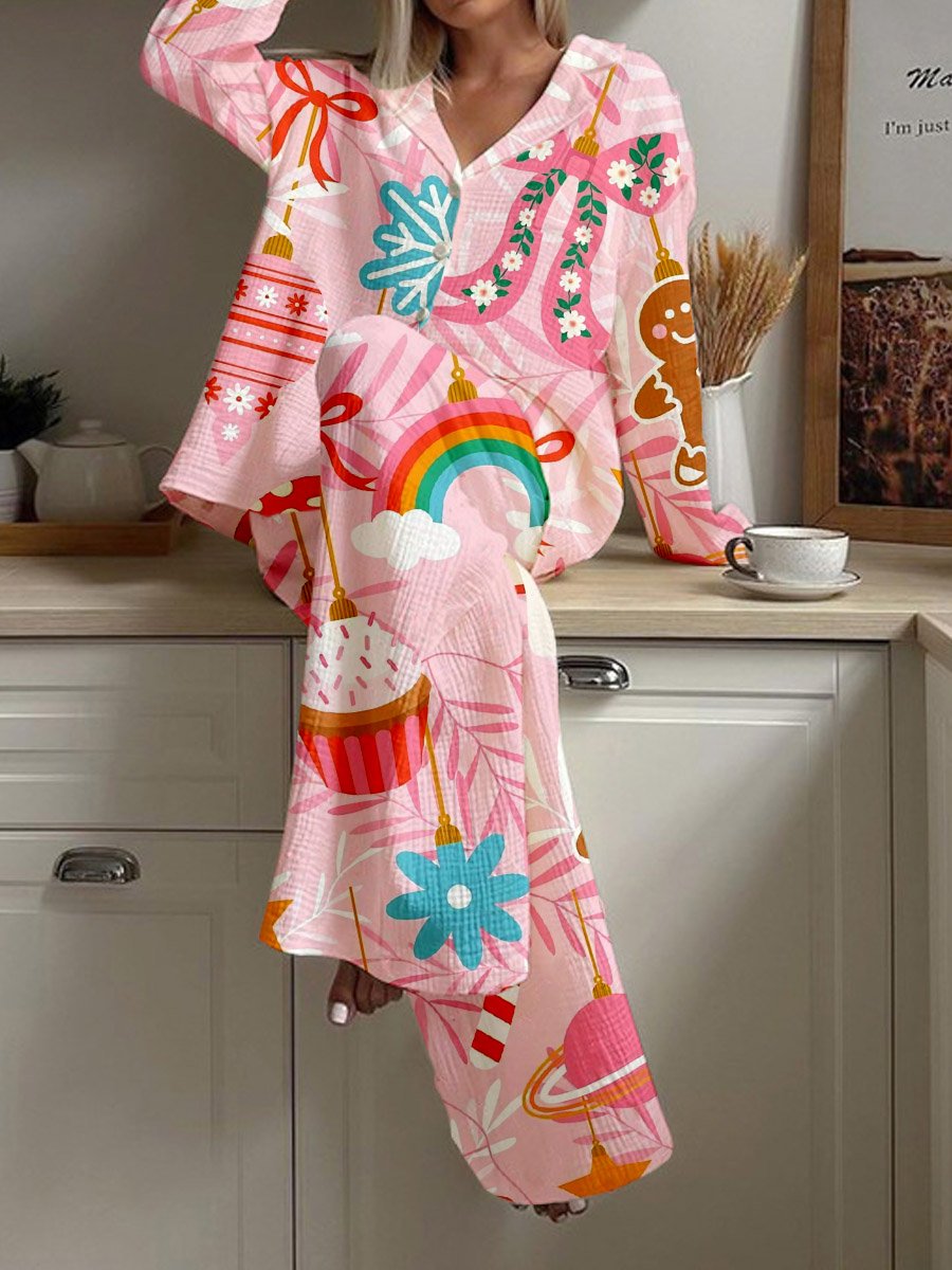 Women's Pink Christmas Bow Print Cardigan Homewear Set