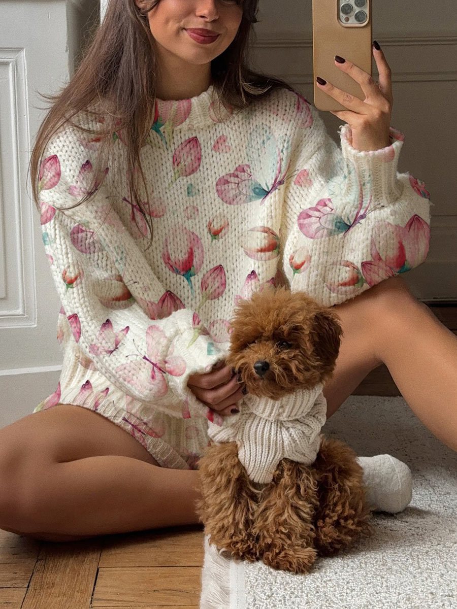 Women's Pink Lotus Pattern Round Neck Long Sleeve Sweater