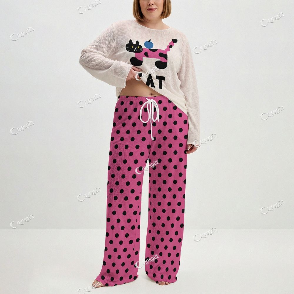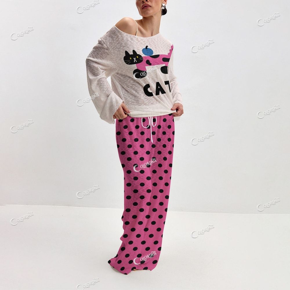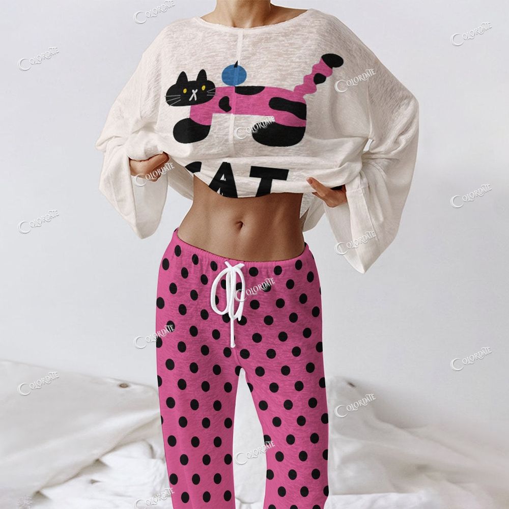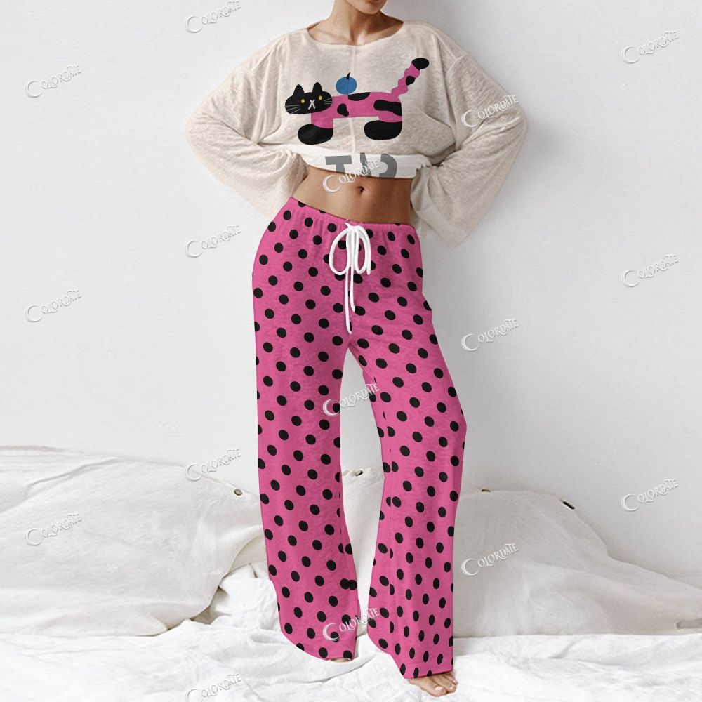 56Women's Cute Cat & Polka Dot Print Long Sleeve Cotton Homewear Set
