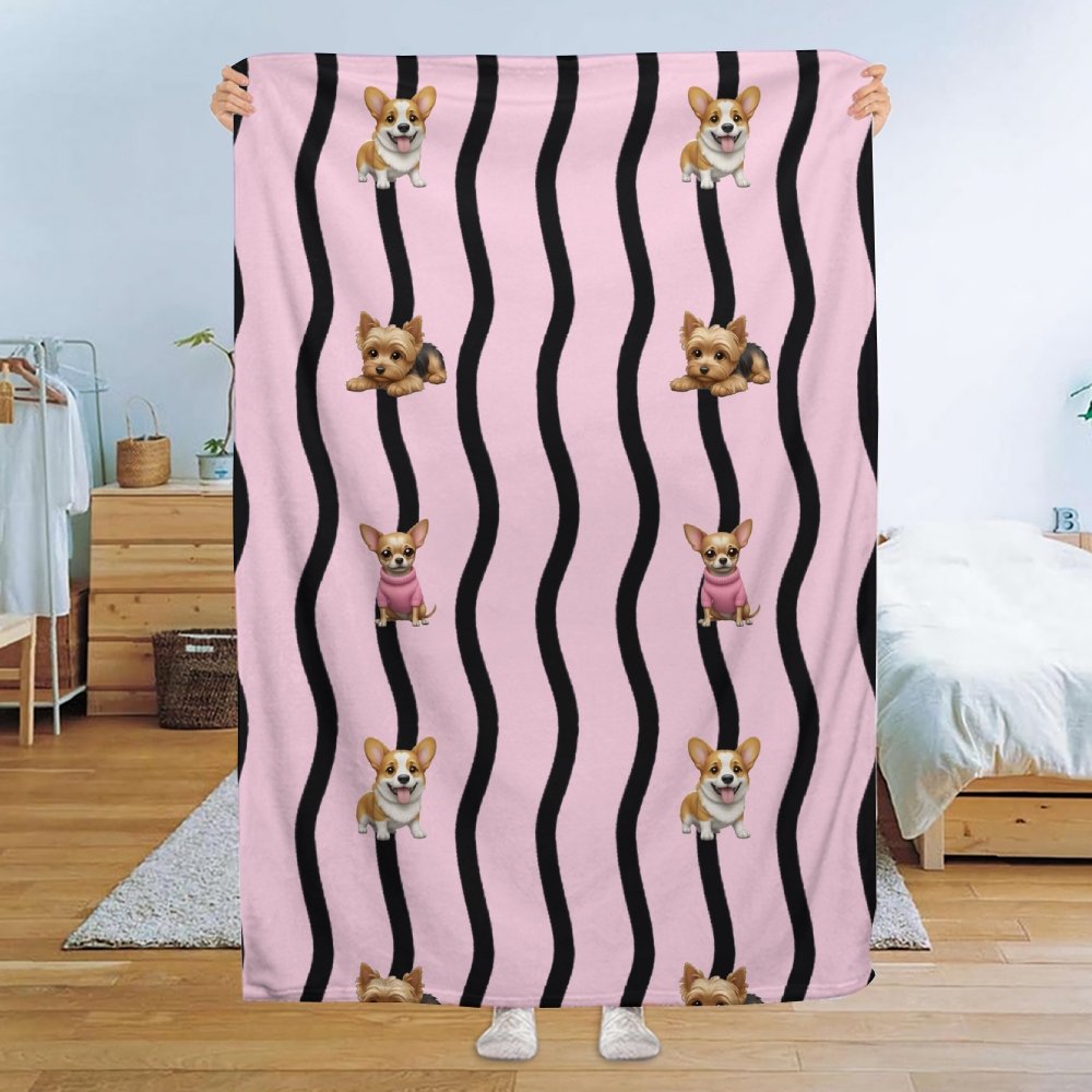 Black Pink Stripes & Dogs Flannel Blanket