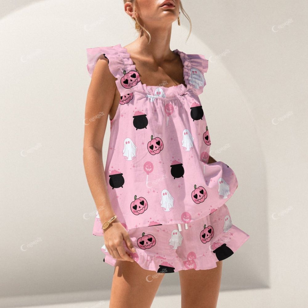 Colordate Pink Pumpkin And Little Ghost Prints Short Tank Top Shorts Pajama Set