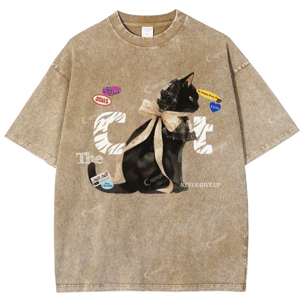 Colordate Unisex Black Cat Printed Washed Tee