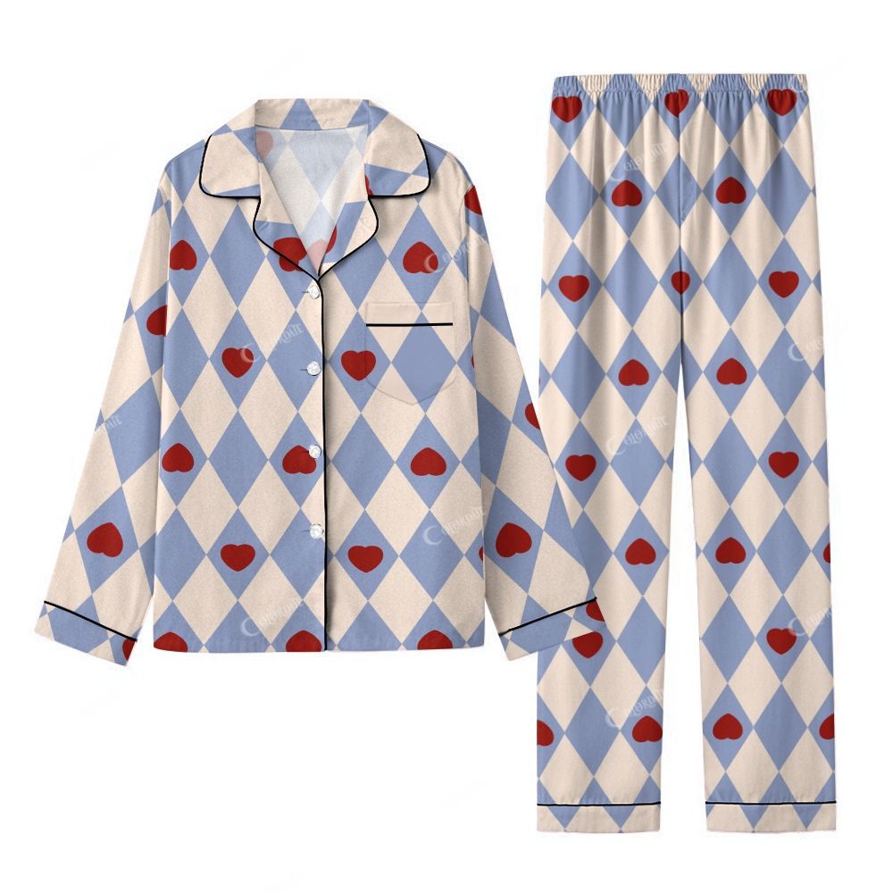 Colordate Women's Blue Checker With Heart Print Home Long Sleeve Suit