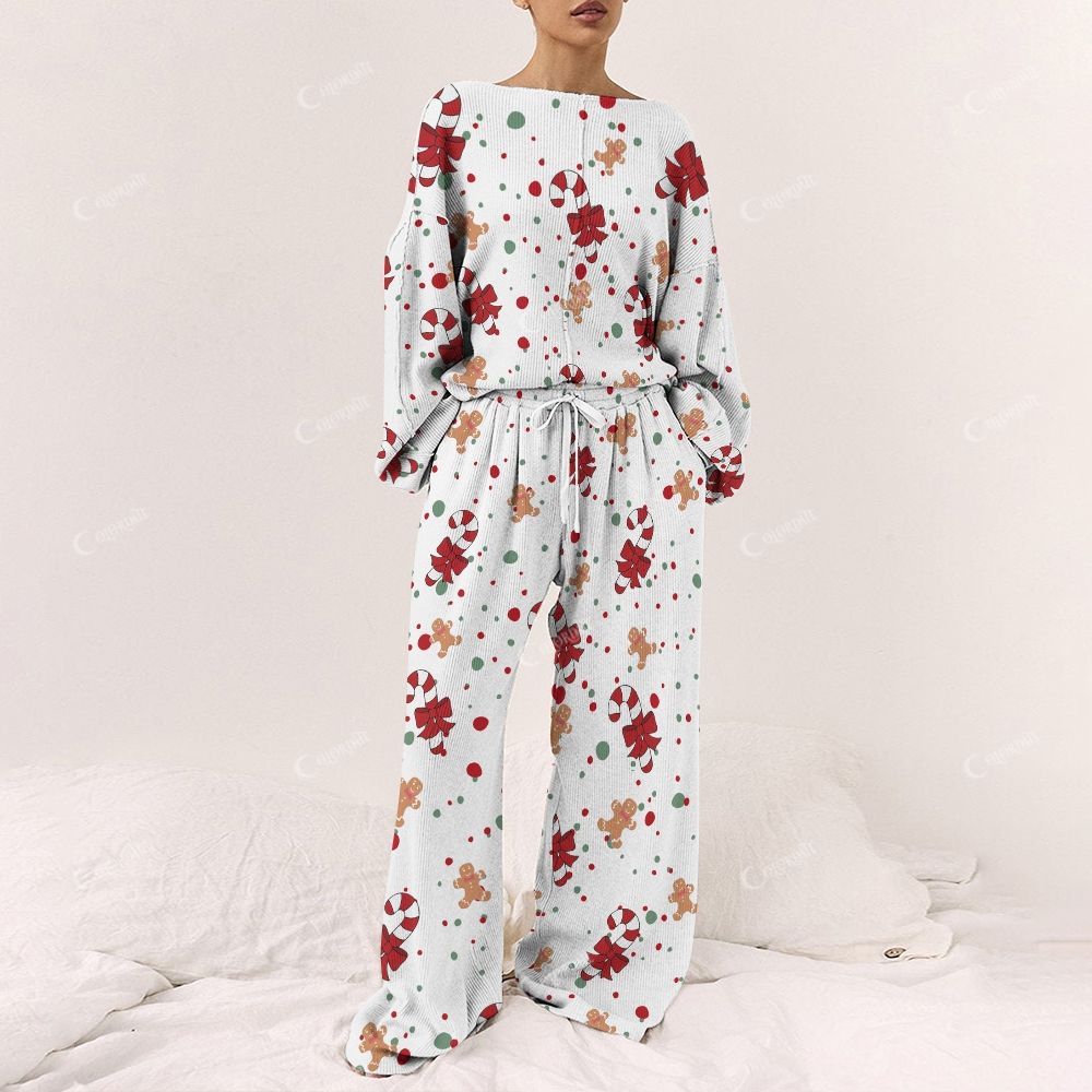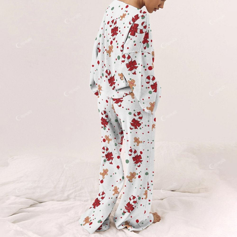 Colordate Women's Candy Cane And Gingerbread Man Print Long Sleeve Pajama Set